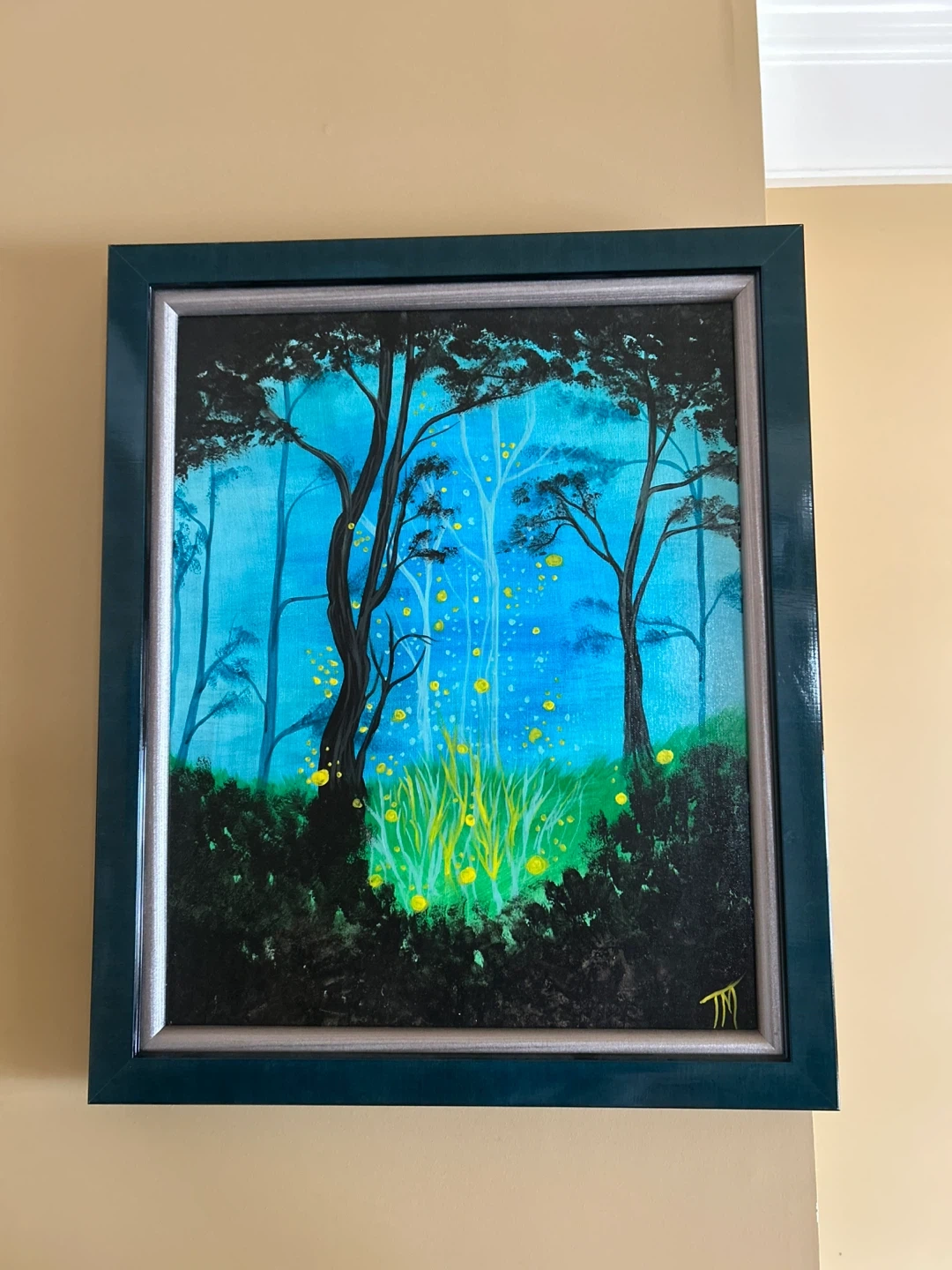 Original acrylic painting featuring a vibrant forest scene with glowing orbs and silhouetted trees. It's set in a dark teal frame with a silver inner accent. This piece would add a touch of enchantment to any room!