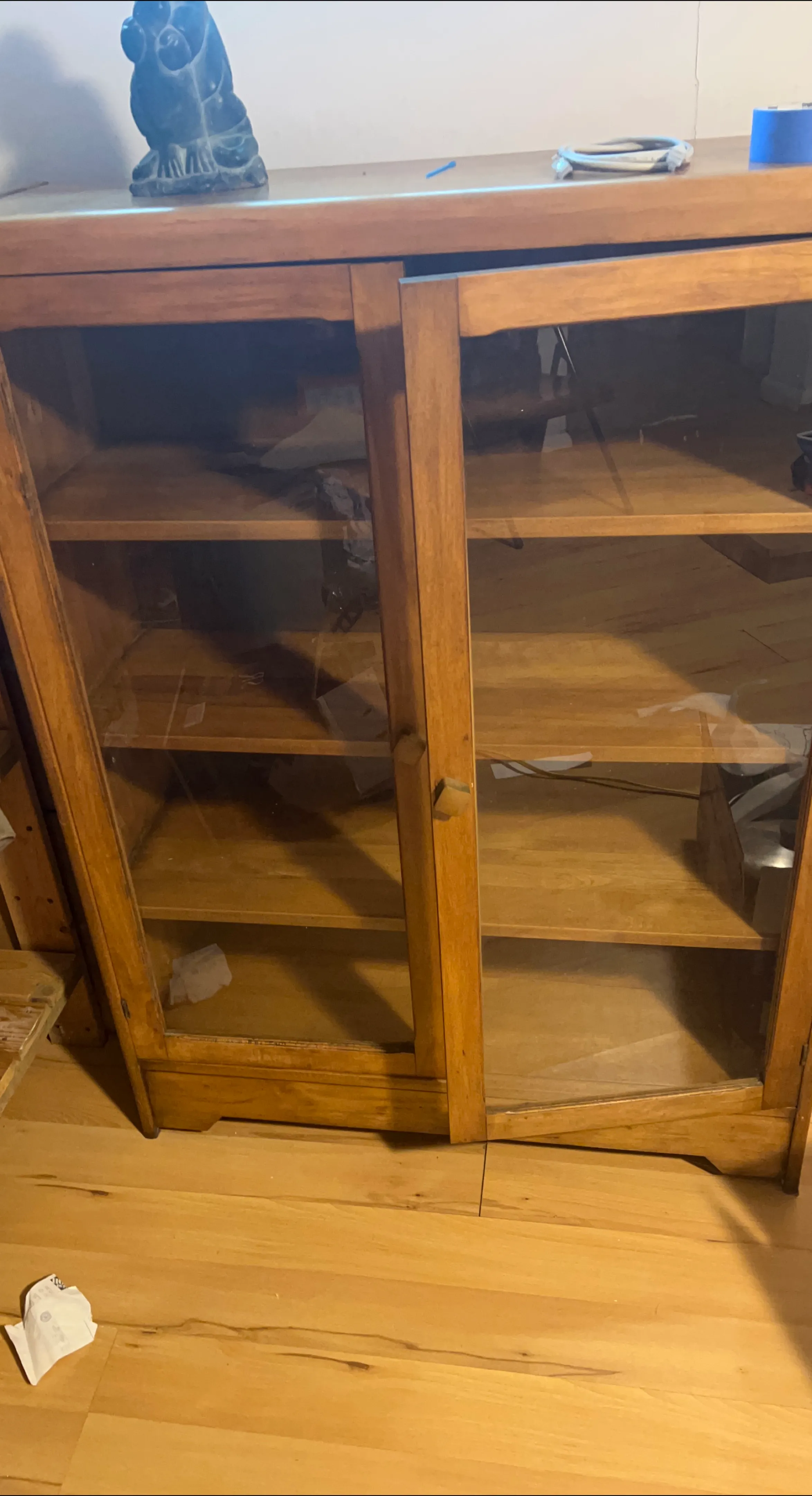 Here's a wooden display cabinet with glass doors. It has multiple shelves for storage and display. Perfect for showcasing your favourite items!