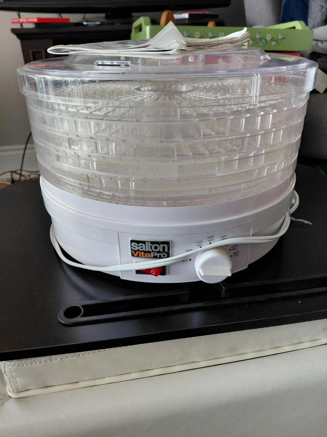 This is a Salton VitaPro food dehydrator with multiple clear trays. It has adjustable temperature settings ranging from 35°C to 70°C. It's handy for preserving fruits, vegetables, or making jerky. CASH & PICK UP ONLY.