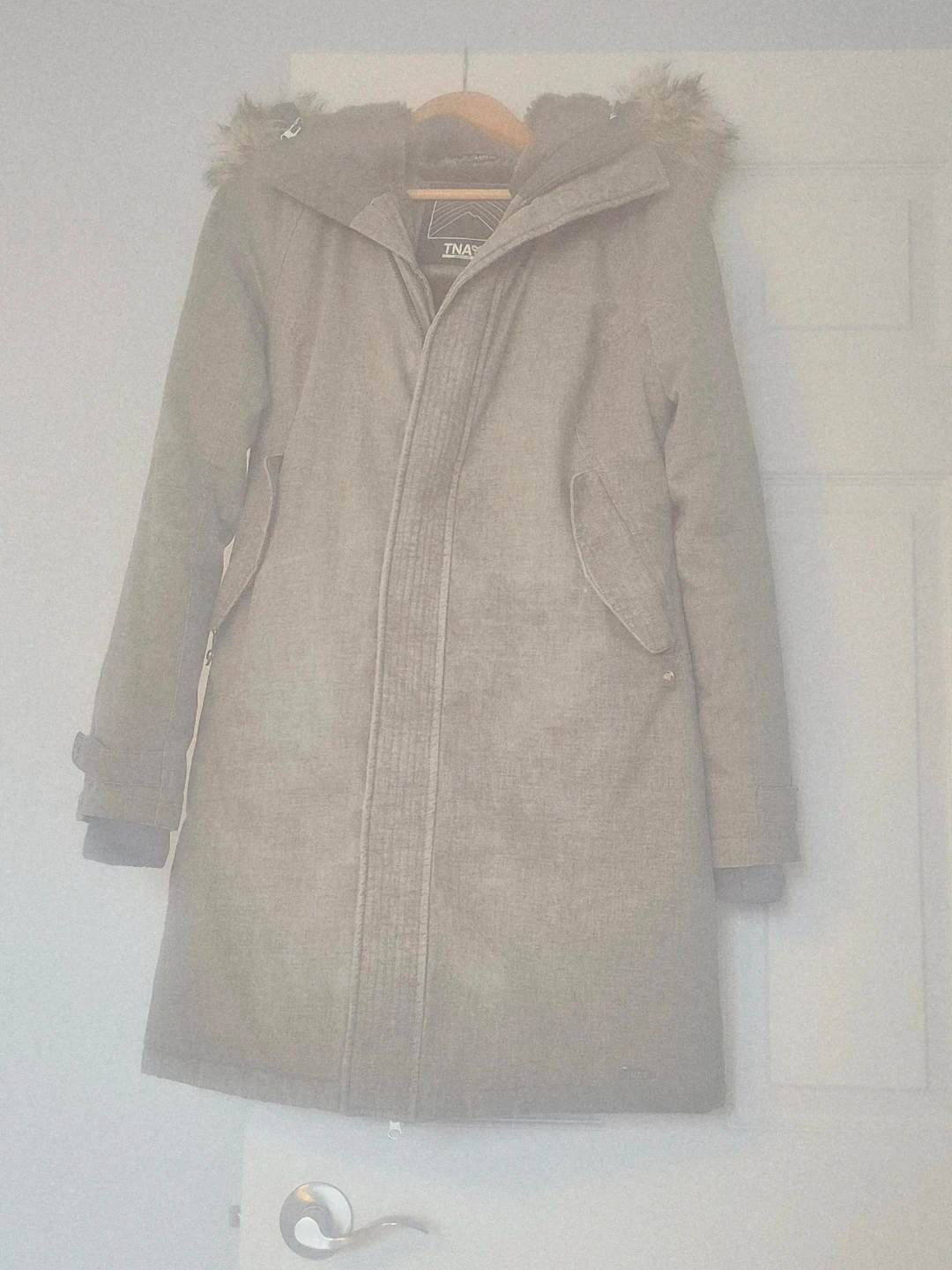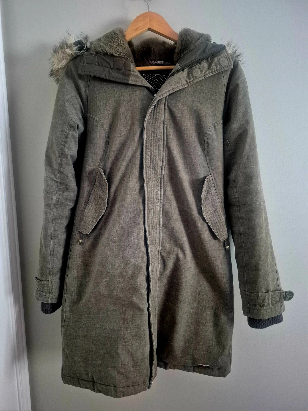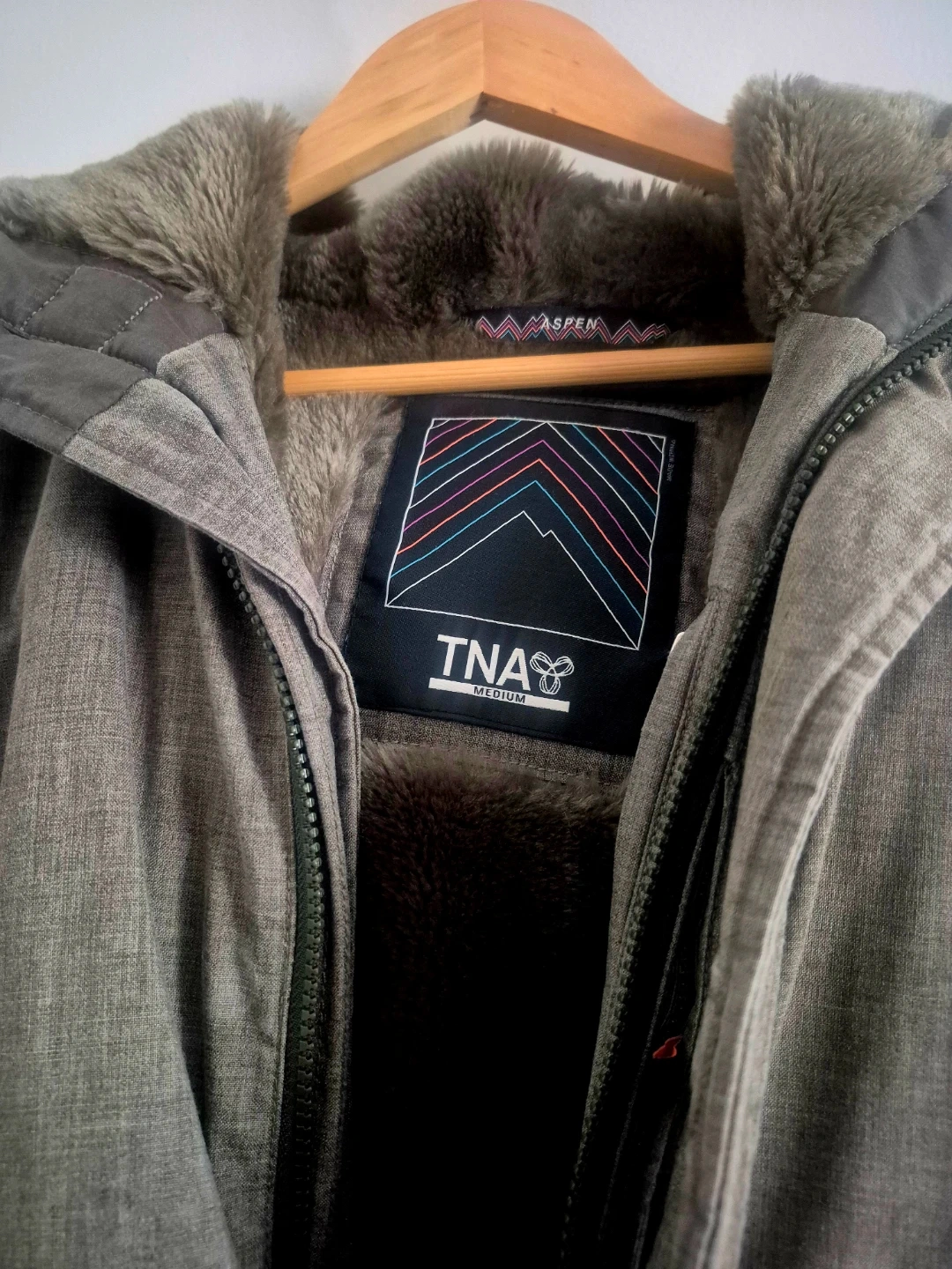 Warm TNA Aspen winter parka with a faux fur-lined hood. It's a size medium and features a grey textured exterior and a cozy, plush interior lining. This jacket is great for staying warm during colder months!