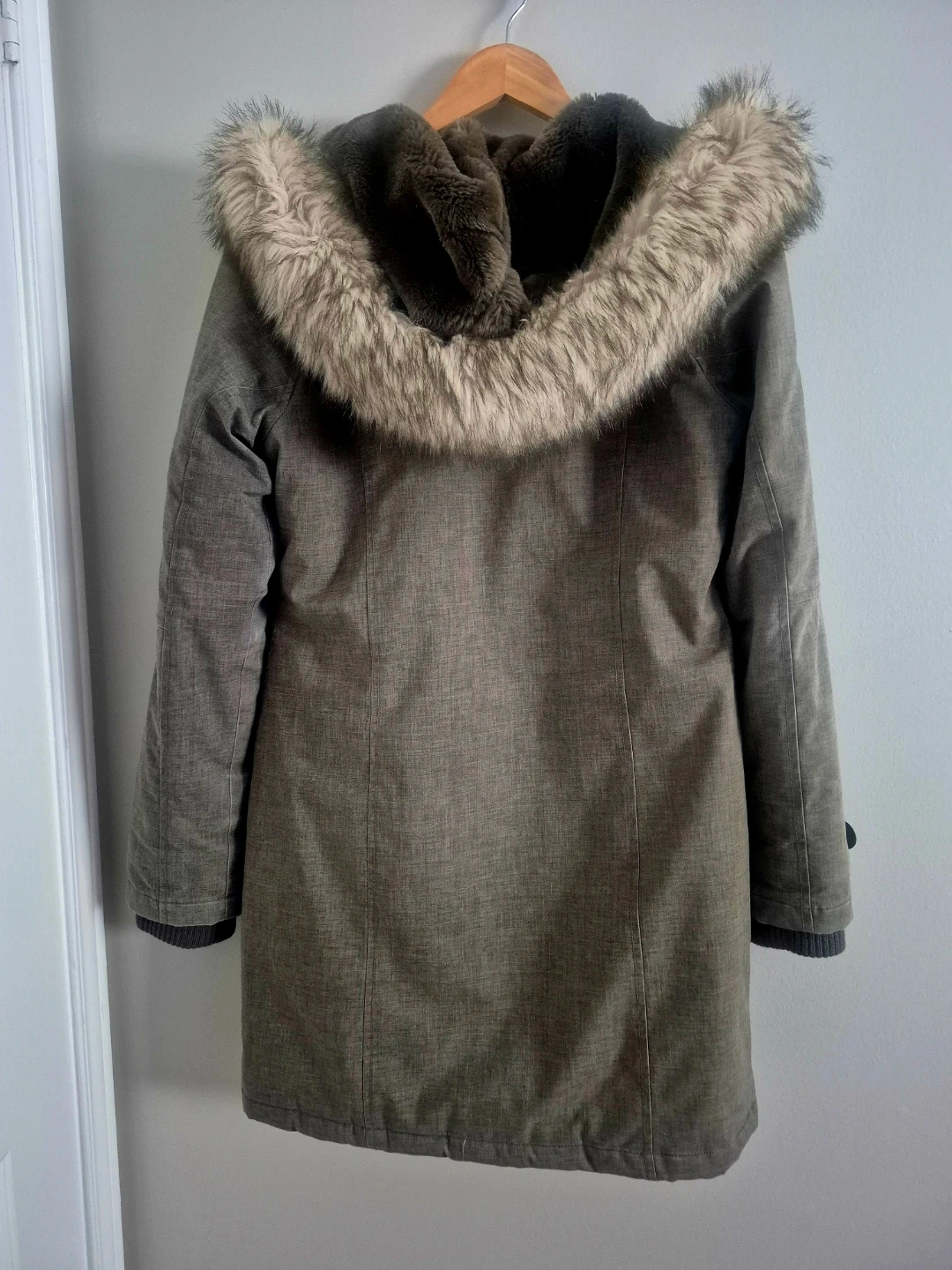 Warm TNA Aspen winter parka with a faux fur-lined hood. It's a size medium and features a grey textured exterior and a cozy, plush interior lining. This jacket is great for staying warm during colder months!