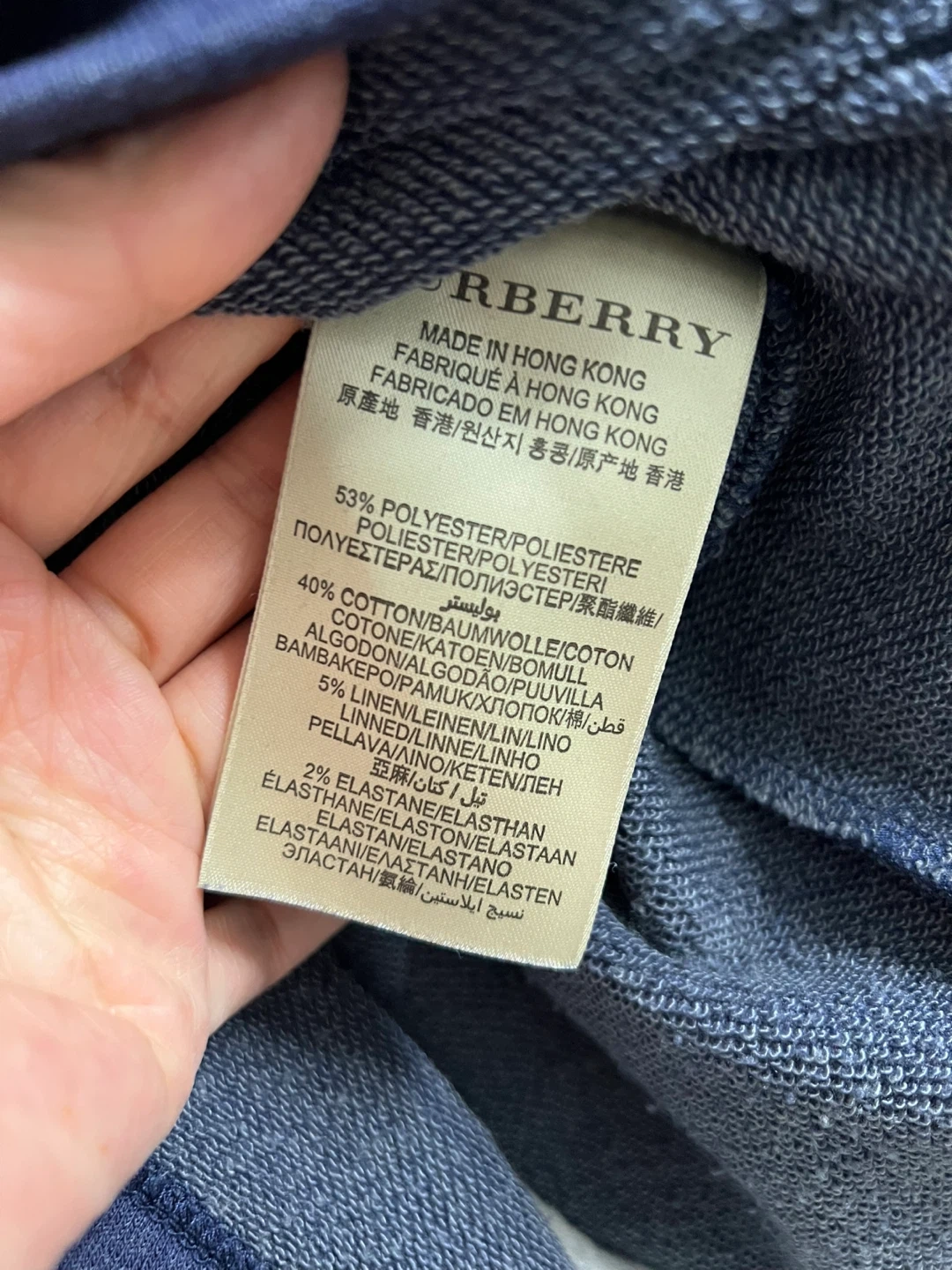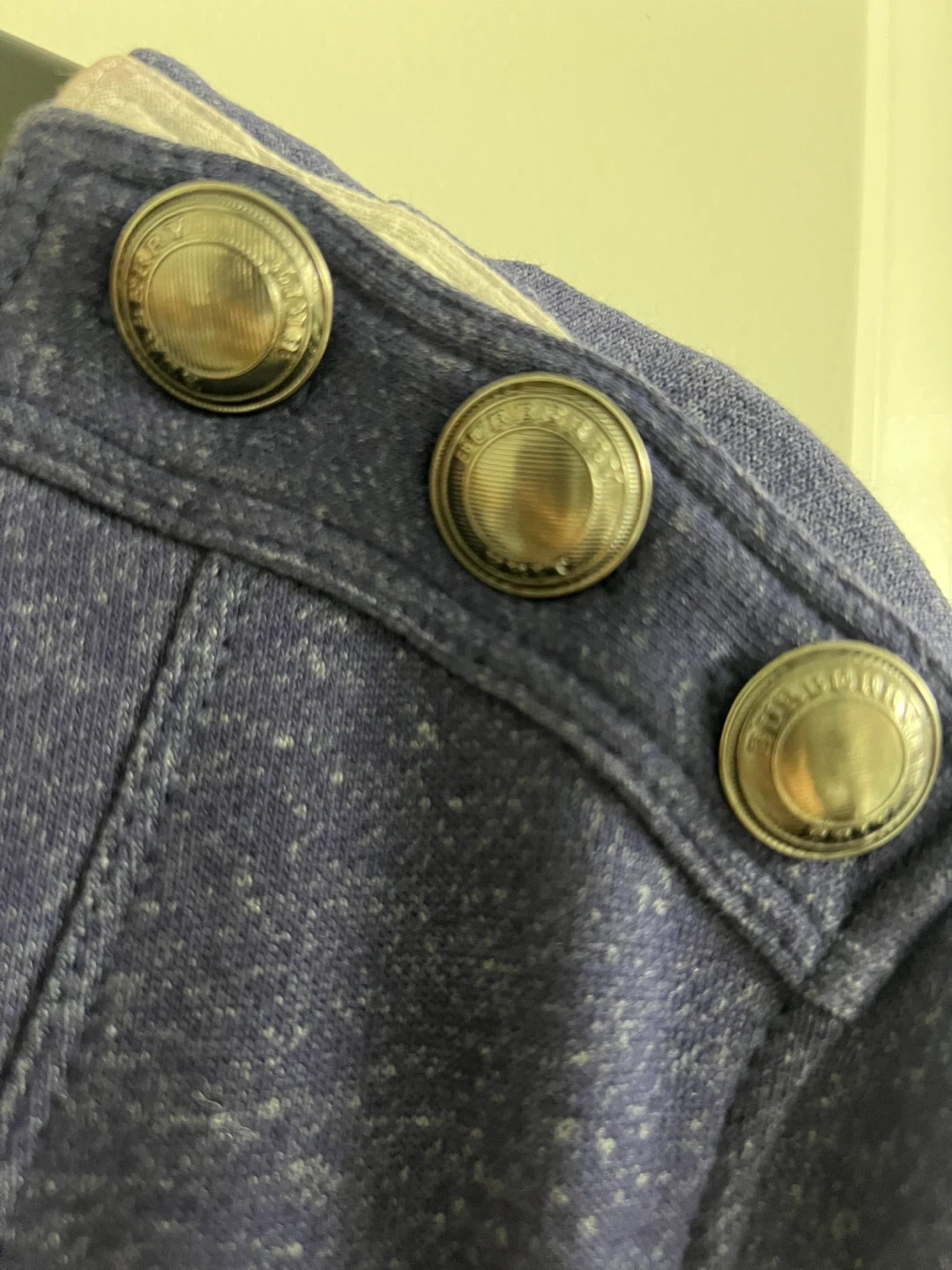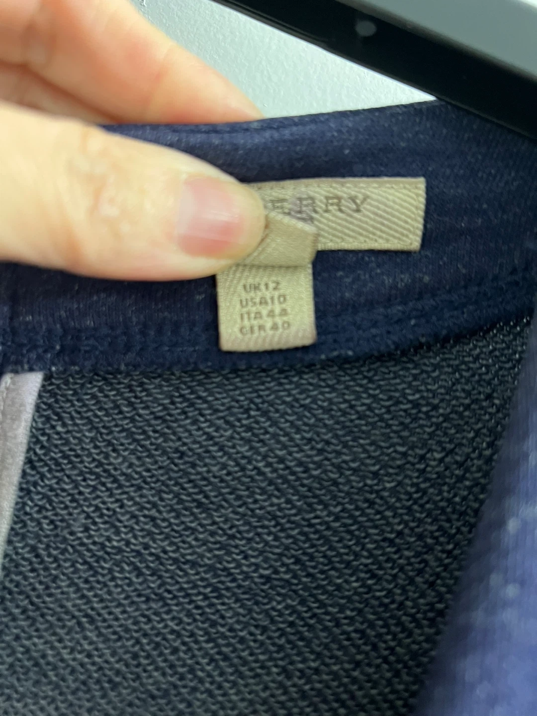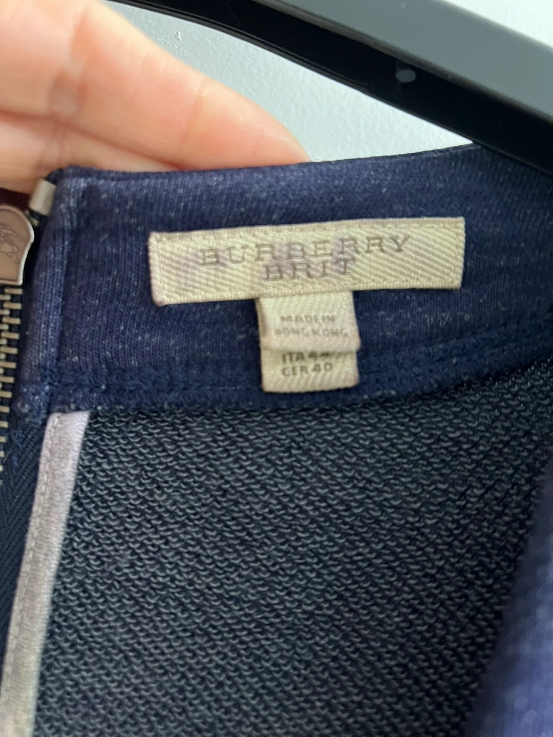 Burberry Brit navy blue short sleeve dress. It features decorative buttons on the shoulders and pockets with button closures. Back zipper closure.