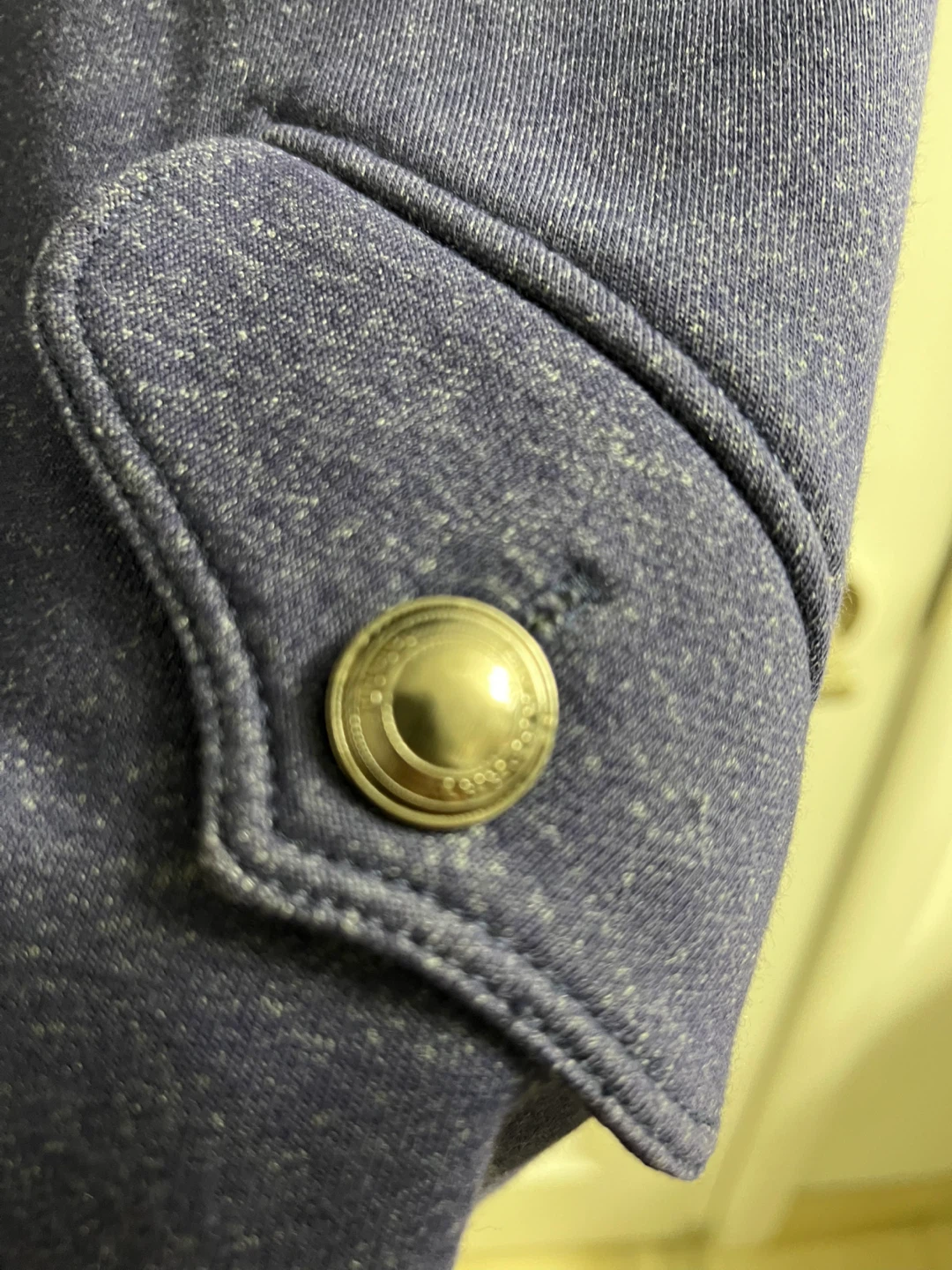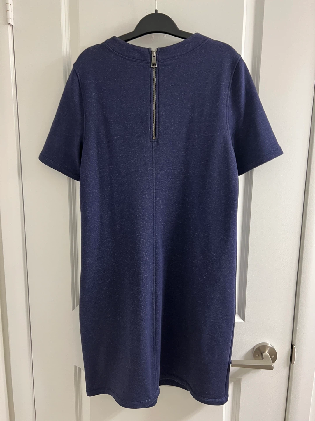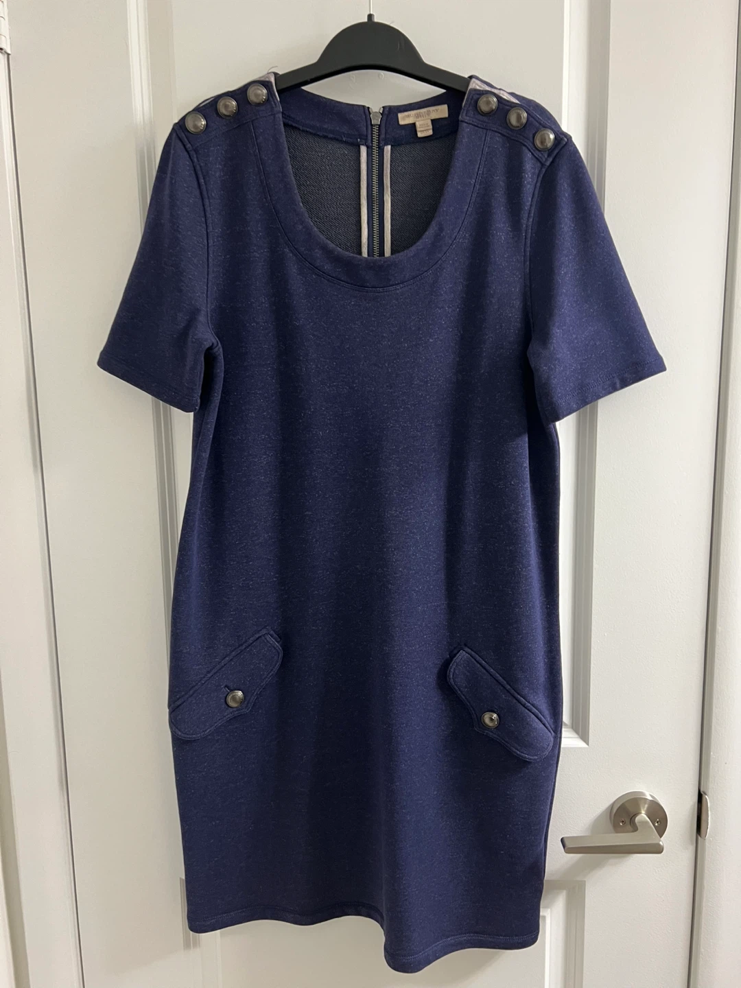 Burberry Brit navy blue short sleeve dress. It features decorative buttons on the shoulders and pockets with button closures. Back zipper closure.