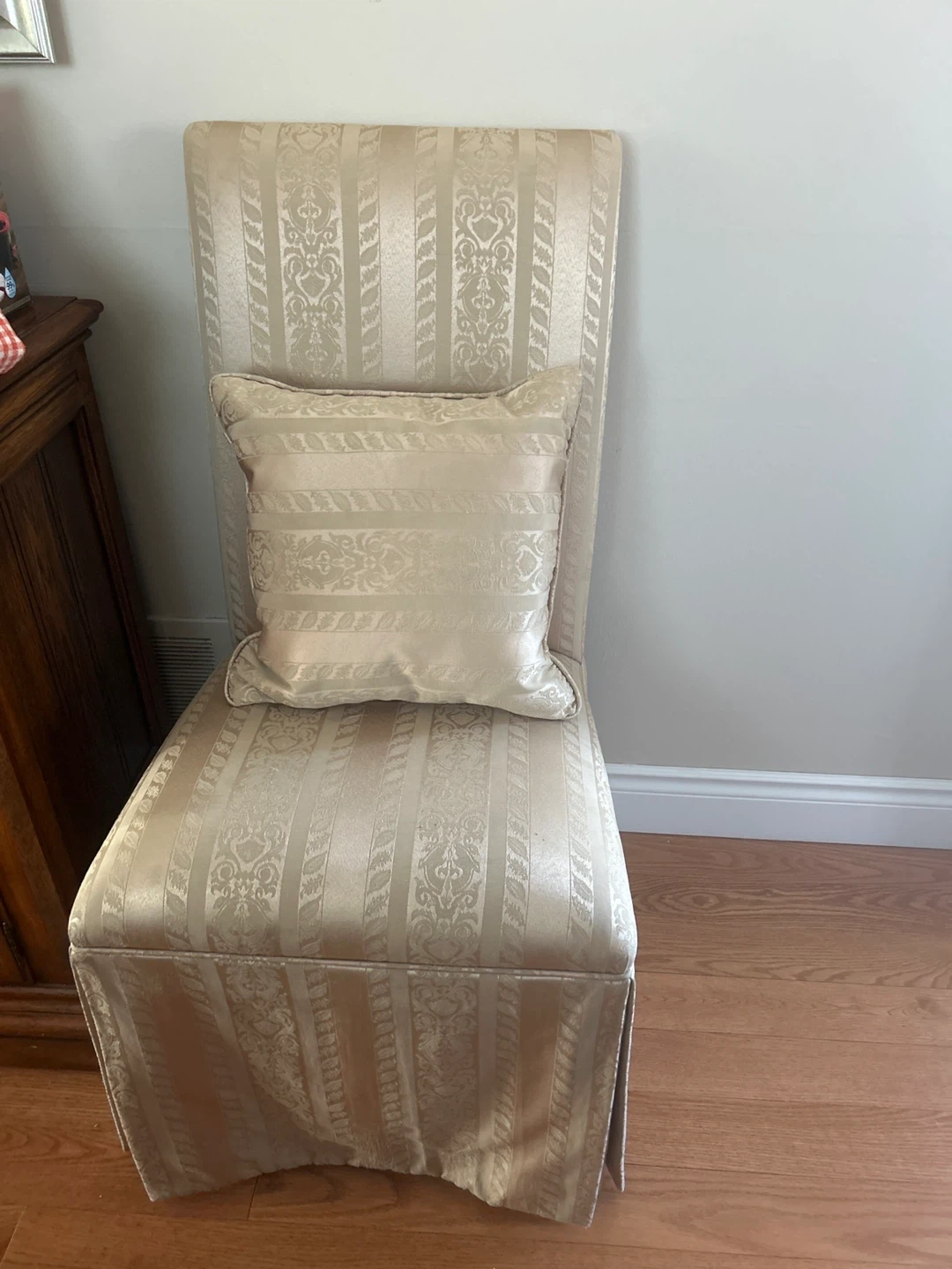 Set of two. This accent chair features a damask stripe pattern in a neutral beige tone. It includes a matching decorative pillow for added comfort and style. The skirted base gives it a classic look.