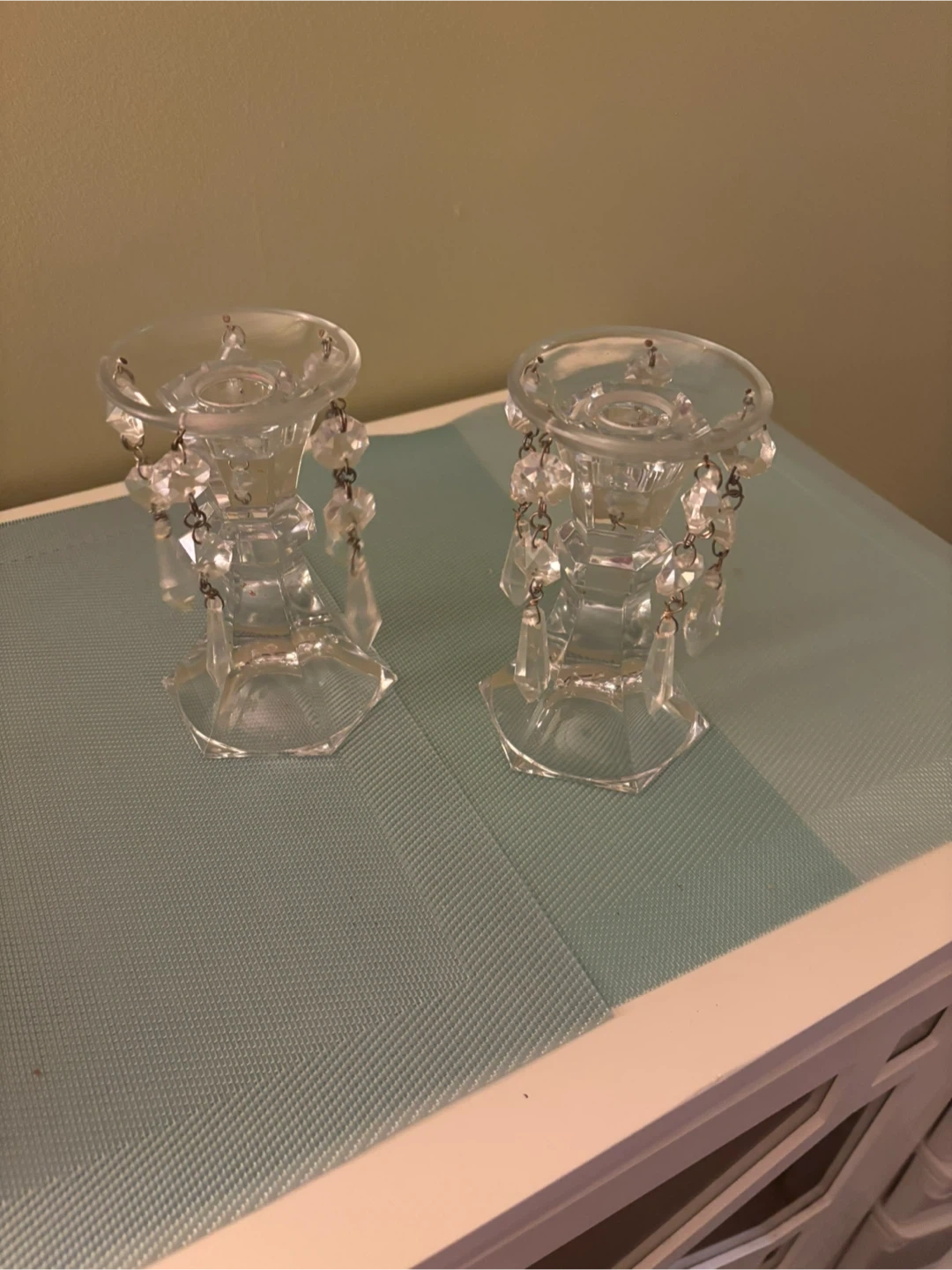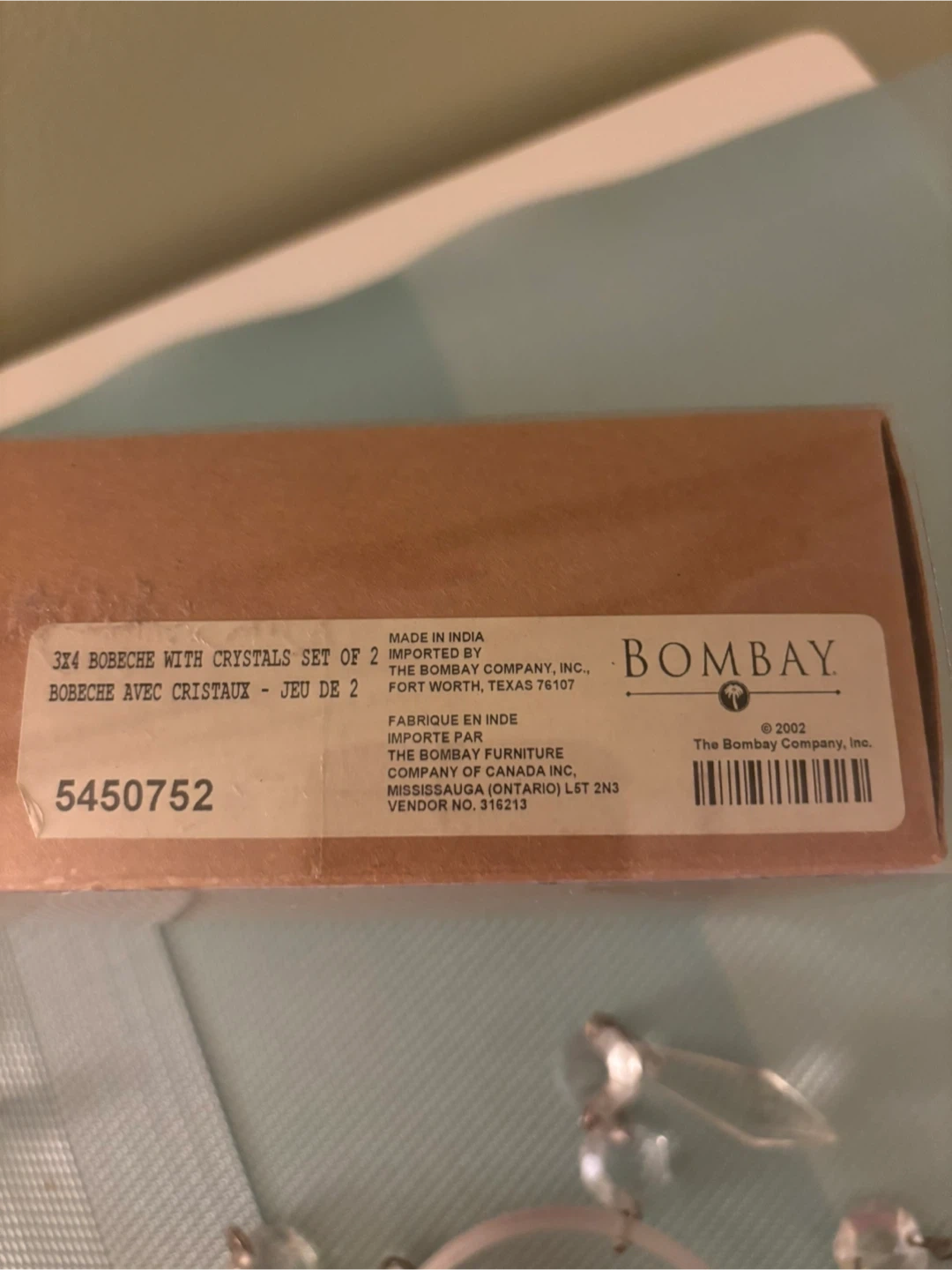 Selling a set of 2 Bombay crystal bobeche candle holders. They are in great condition and come with the original box. These are perfect for adding a touch of elegance to any room!
