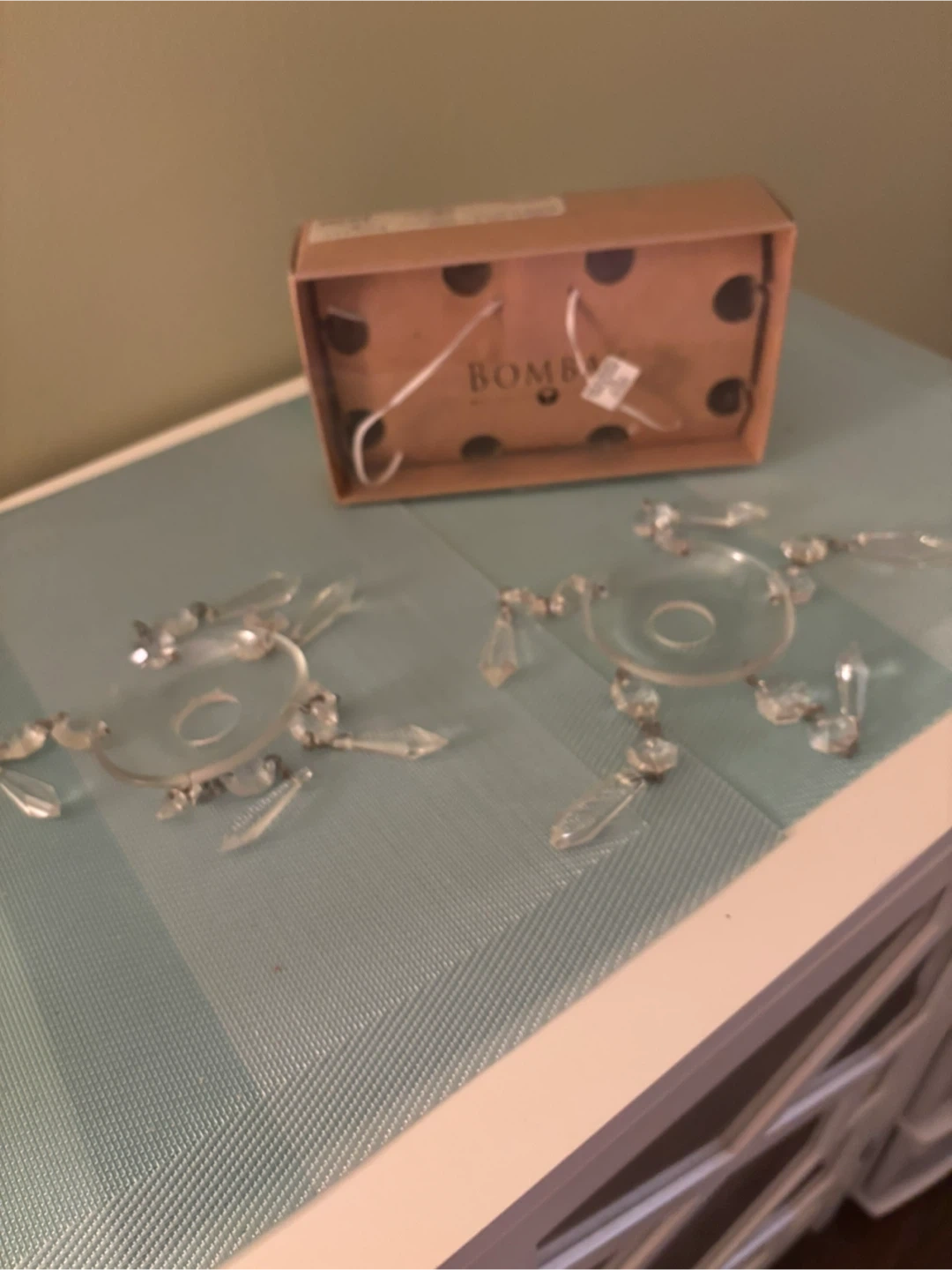 Selling a set of 2 Bombay crystal bobeche candle holders. They are in great condition and come with the original box. These are perfect for adding a touch of elegance to any room!