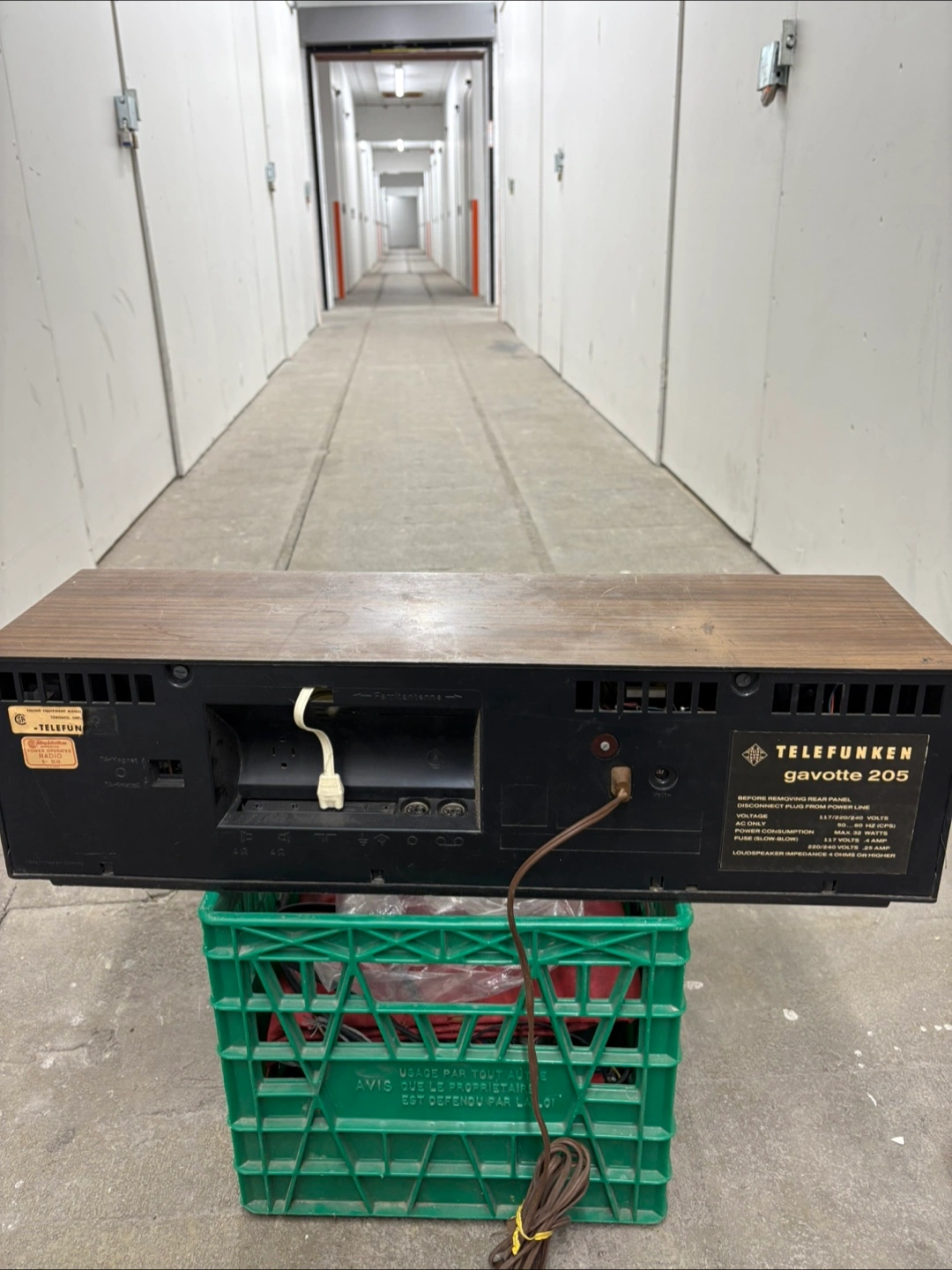 This TELEFUNKEN Gavotte 205 is an AM/FM stereo radio with a classic wooden casing. It features a large tuning dial and various control knobs. This unit's power consumption is 50 Watts.