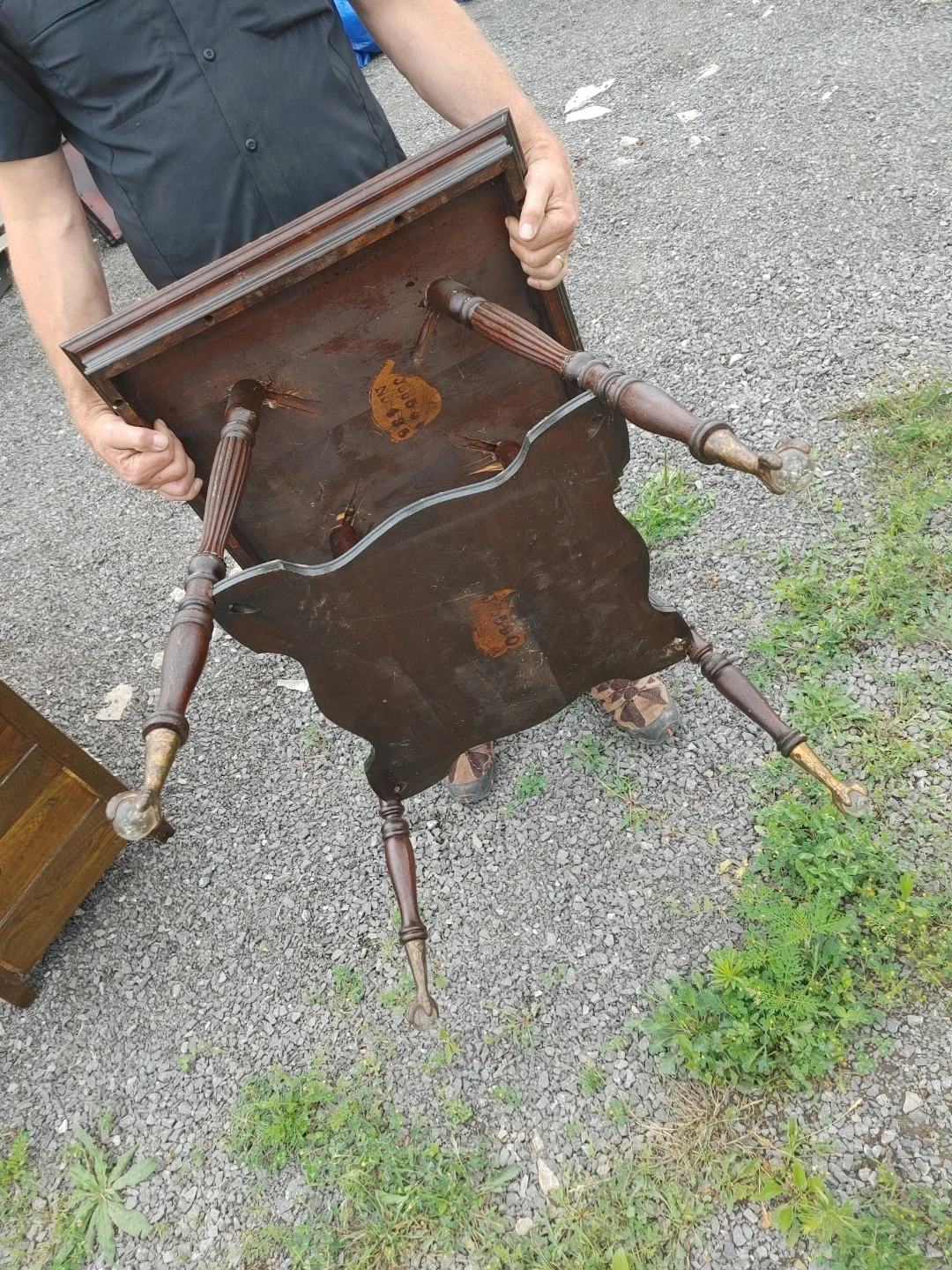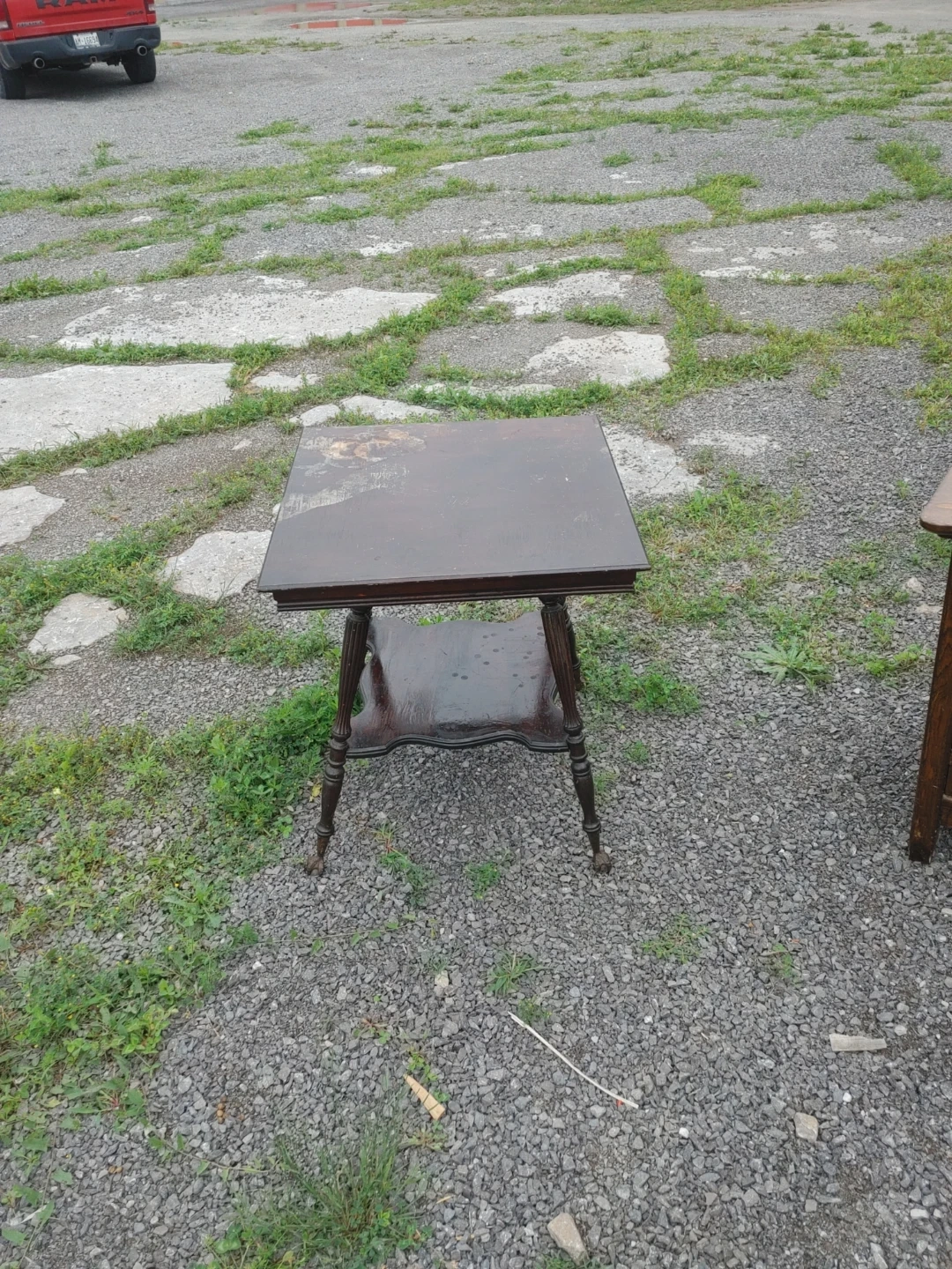 This is a dark wood Queen Anne table with decorative legs and brass accents. It has a lower shelf for added storage. The wood has a nice patina from age. It's perfect for placing next to a chair or sofa.