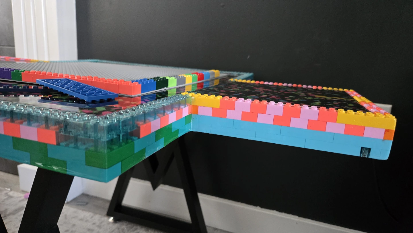 A unique coffee table featuring a colourful Lego build with matching river rock. Under a clear resin top. It sits on sturdy black metal legs.