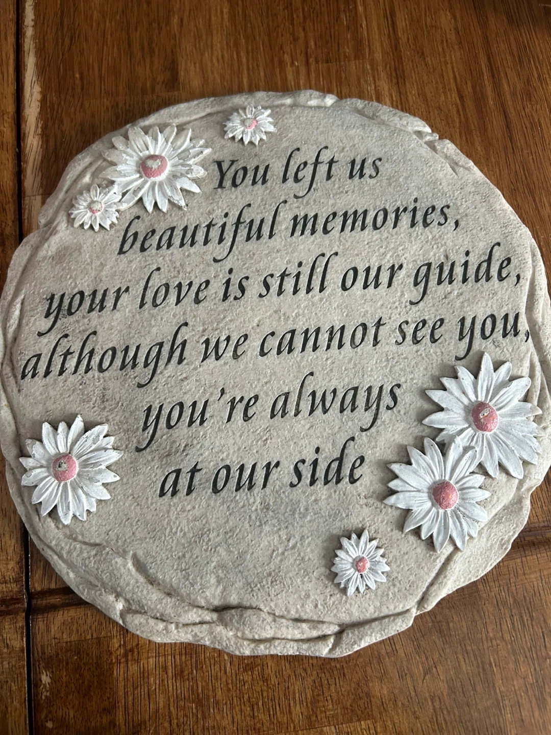 Stone garden marker with engraved memorial text and decorative daisies. This decorative piece is suitable for outdoor display in a garden or memorial space. The inscription reads: 'You left us beautiful memories, your love is still our guide, although we cannot see you, you're always at our side'.