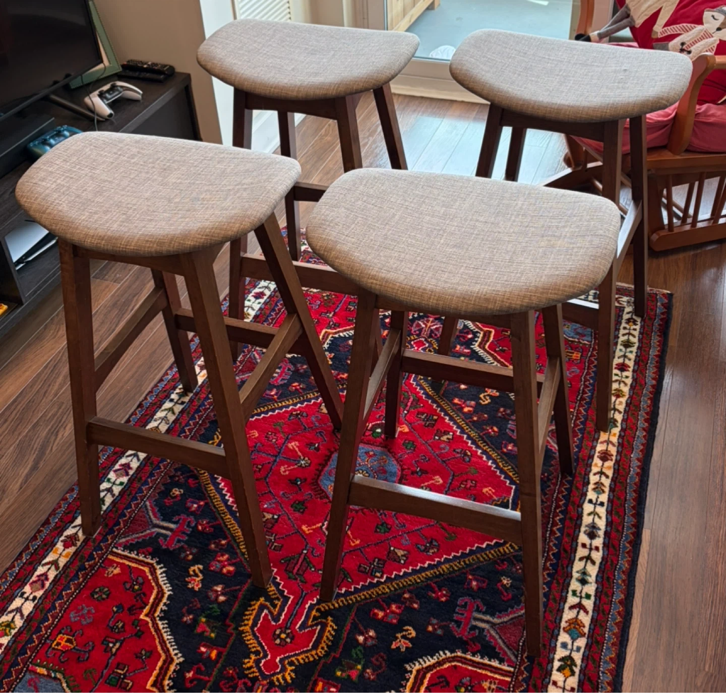 Four comfortable bar stools with grey fabric upholstered seats and dark wooden frames. Seat width is approximately 17 inches. These stools are great for a kitchen island or home bar setup.