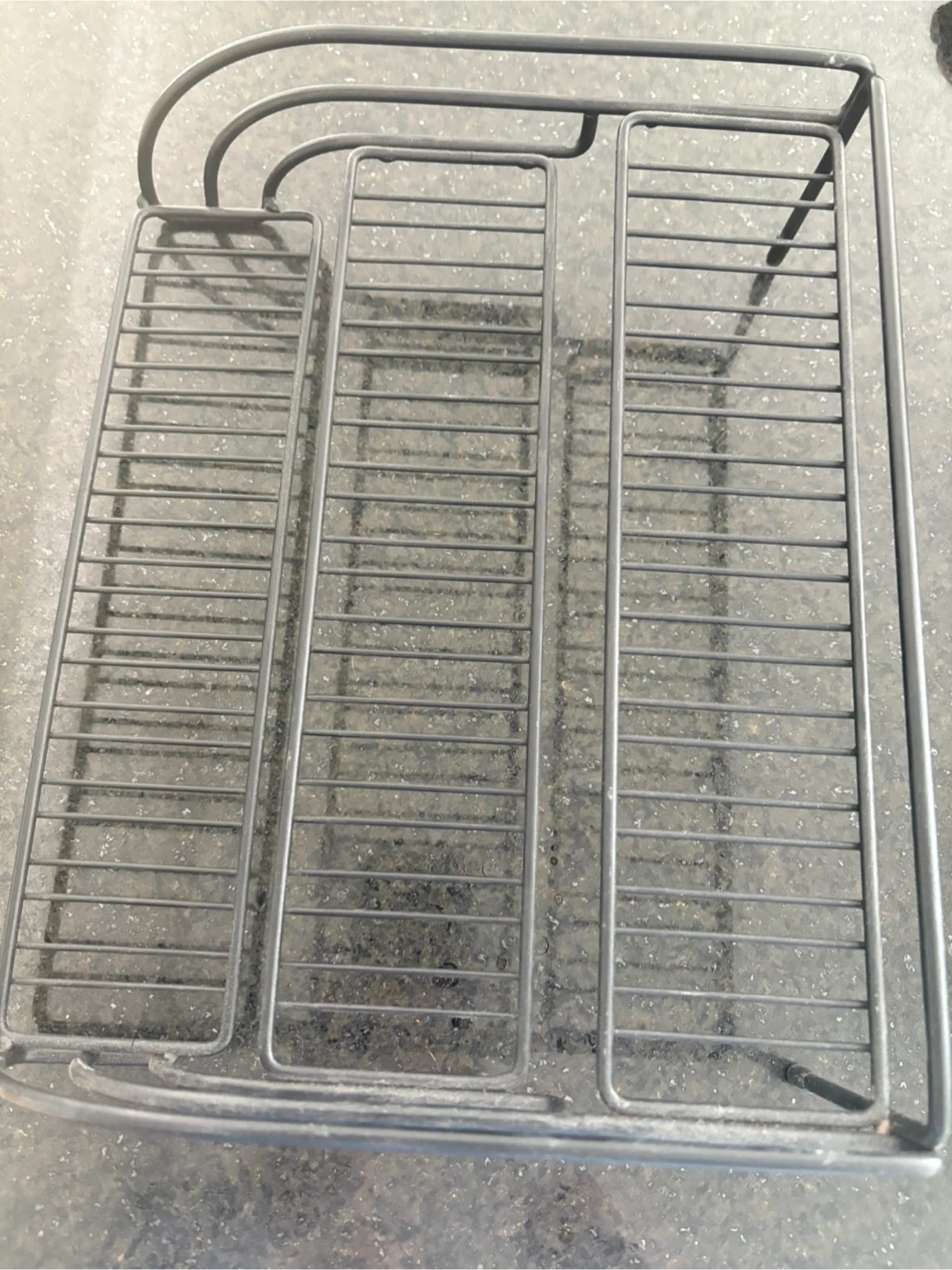 This is a wire drawer organizer tray with three compartments. It's great for storing utensils or other kitchen gadgets. Made of durable metal.