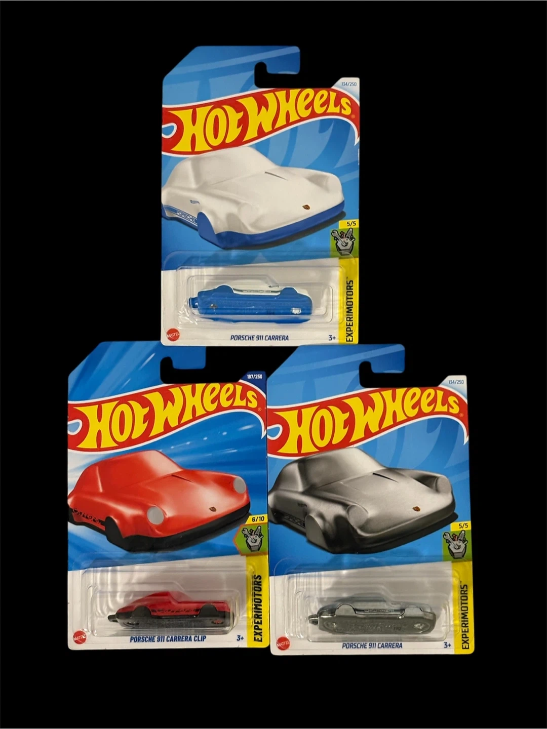 Selling three Hot Wheels Porsche 911 Carrera cars! There's a white and blue Porsche 911 Carrera, a red Porsche 911 Carrera Clip, and a silver Porsche 911 Carrera.