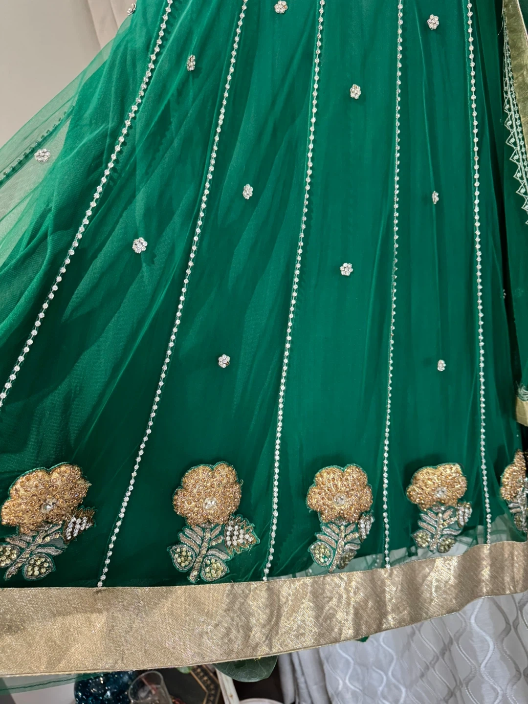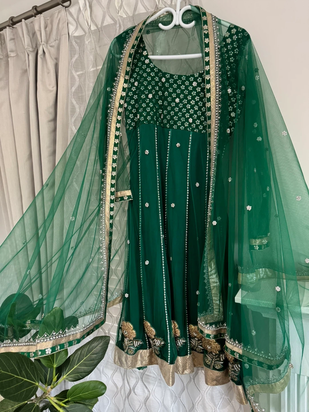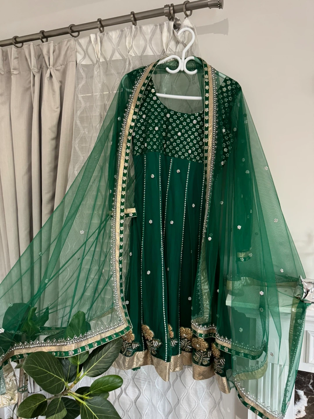 Beautiful green kurti with intricate white floral embellishments and gold accents. Comes with a matching sheer dupatta. Perfect for festive occasions!