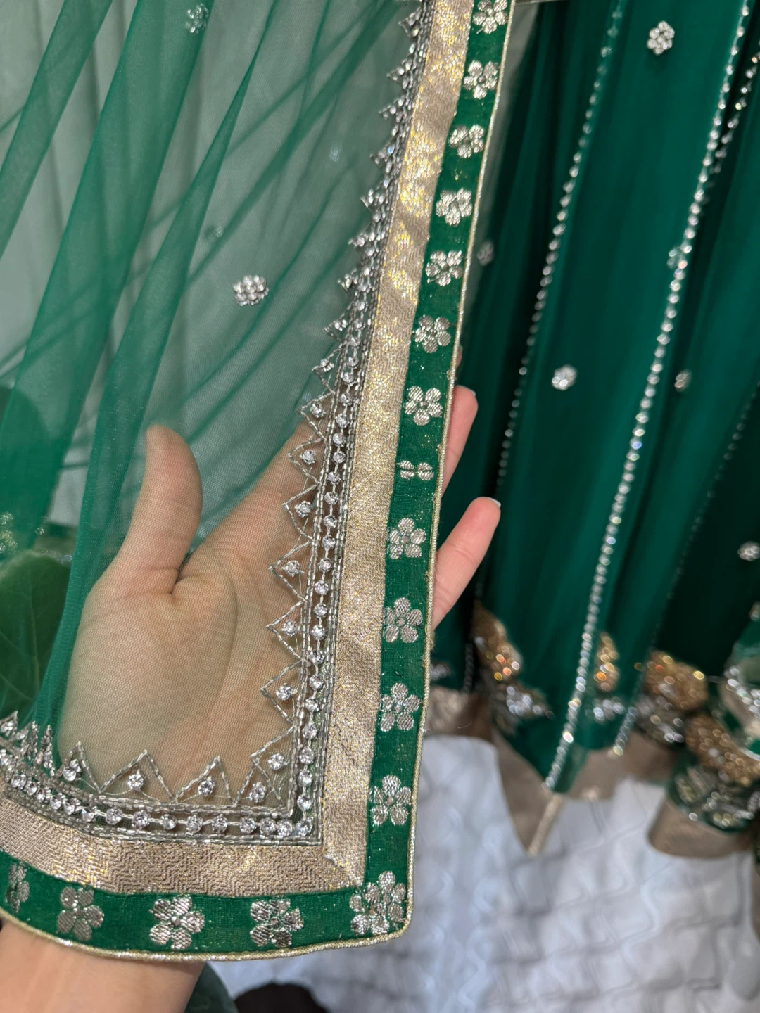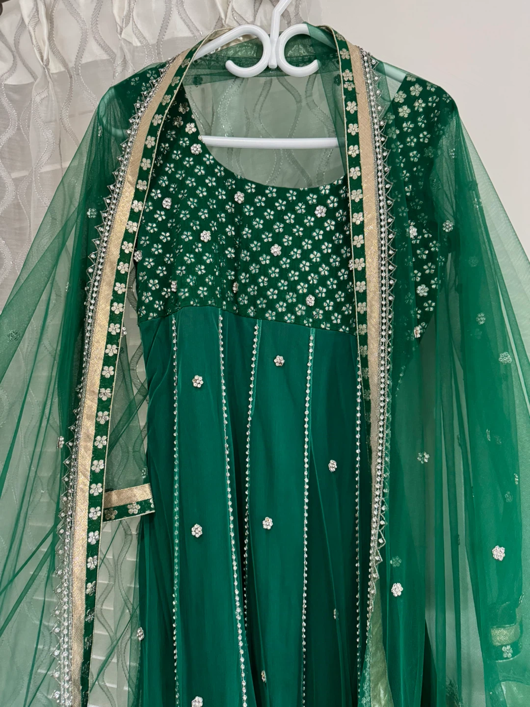 Beautiful green kurti with intricate white floral embellishments and gold accents. Comes with a matching sheer dupatta. Perfect for festive occasions!