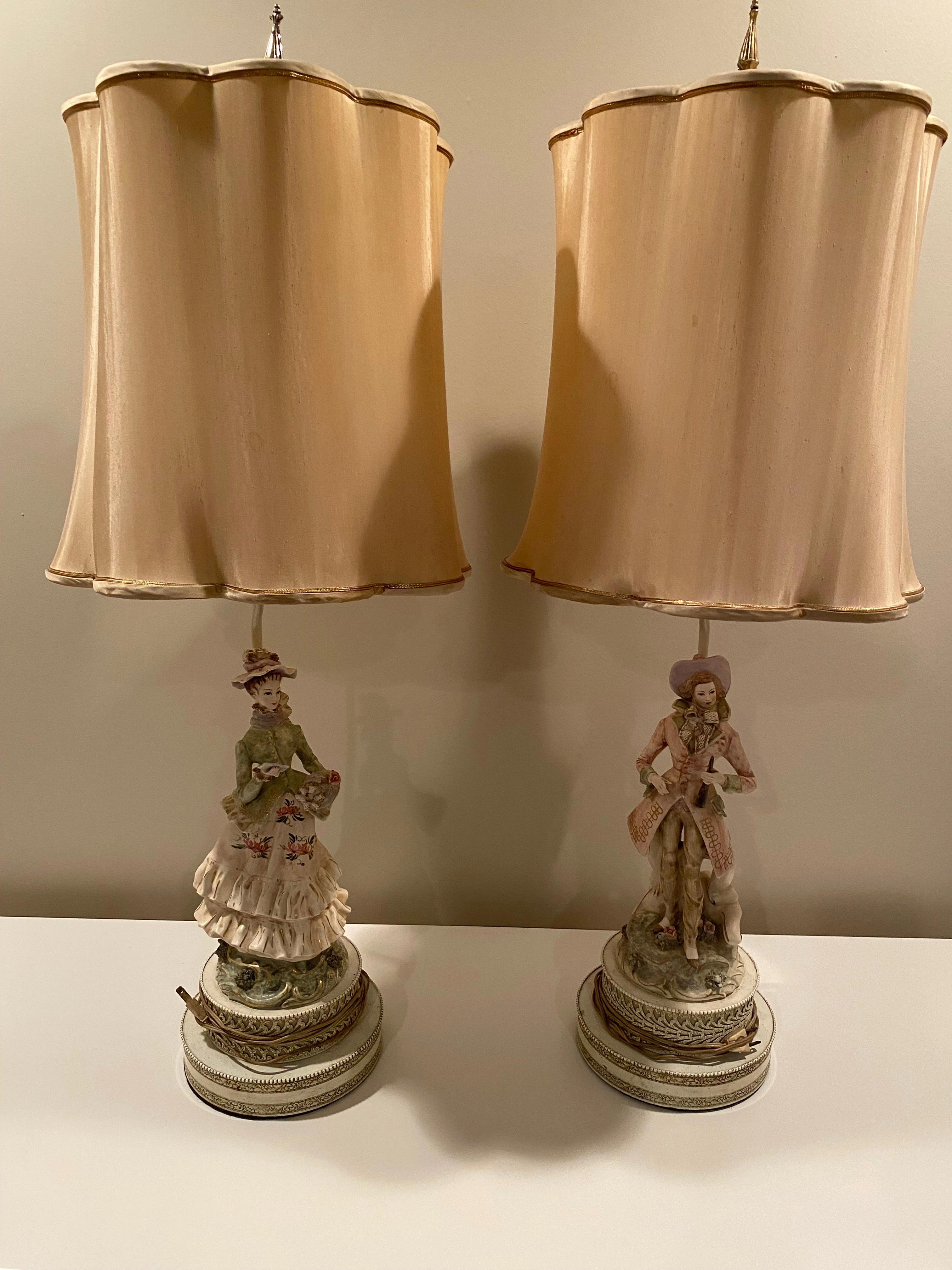 Selling a pair of vintage lamps in the Capodimonte style. They feature detailed figurines and elegant shades. Perfect for adding a touch of classic charm to any room.