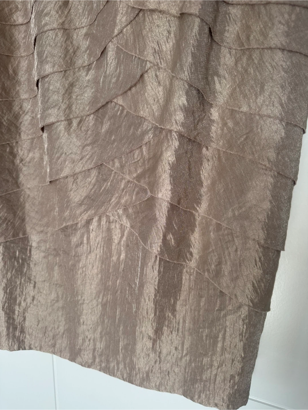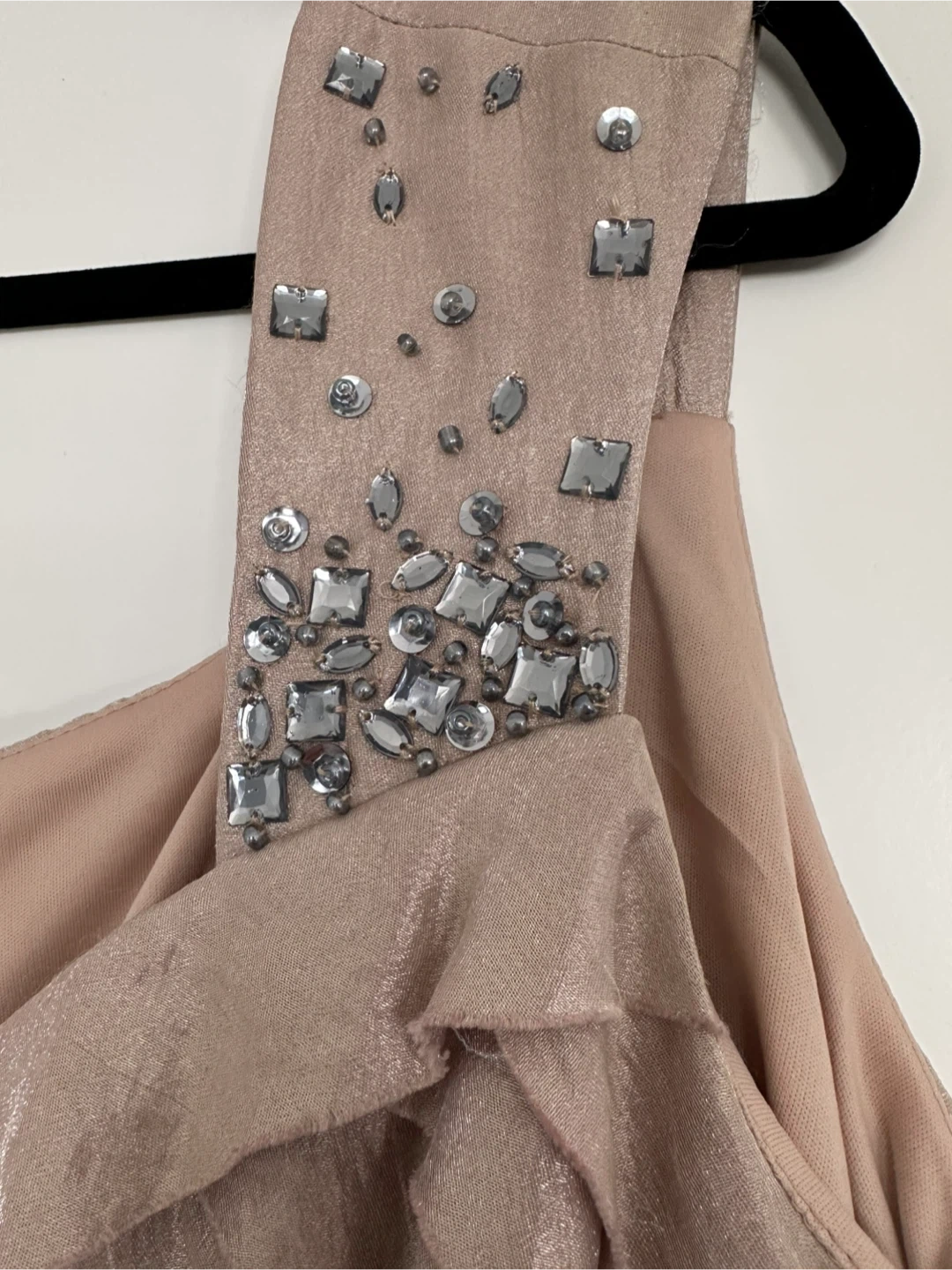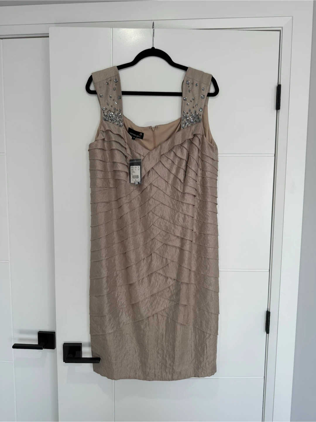Laura Plus taupe dress with tiered detailing and embellished shoulders. Size 18. Includes original tags and extra beads.
