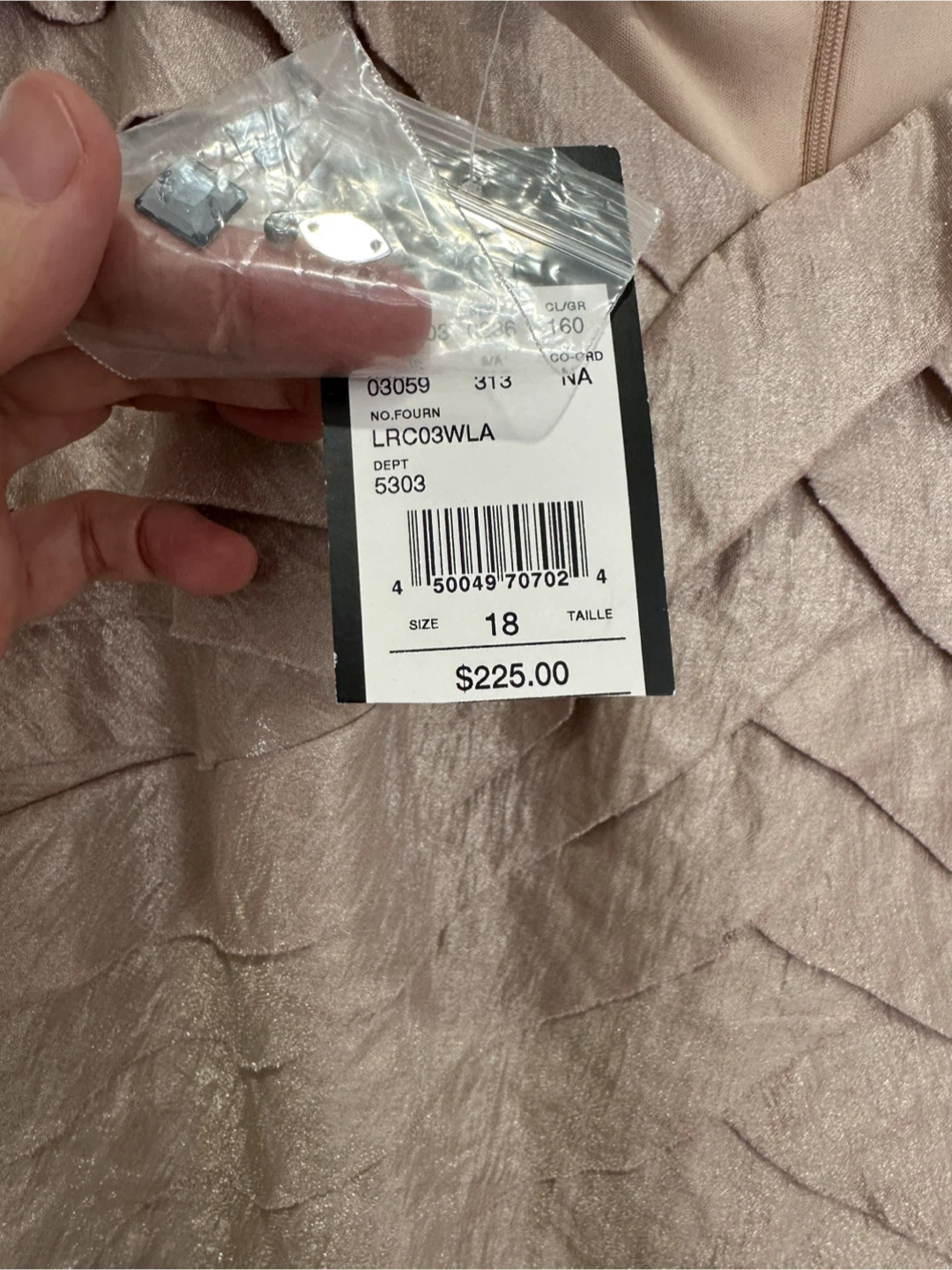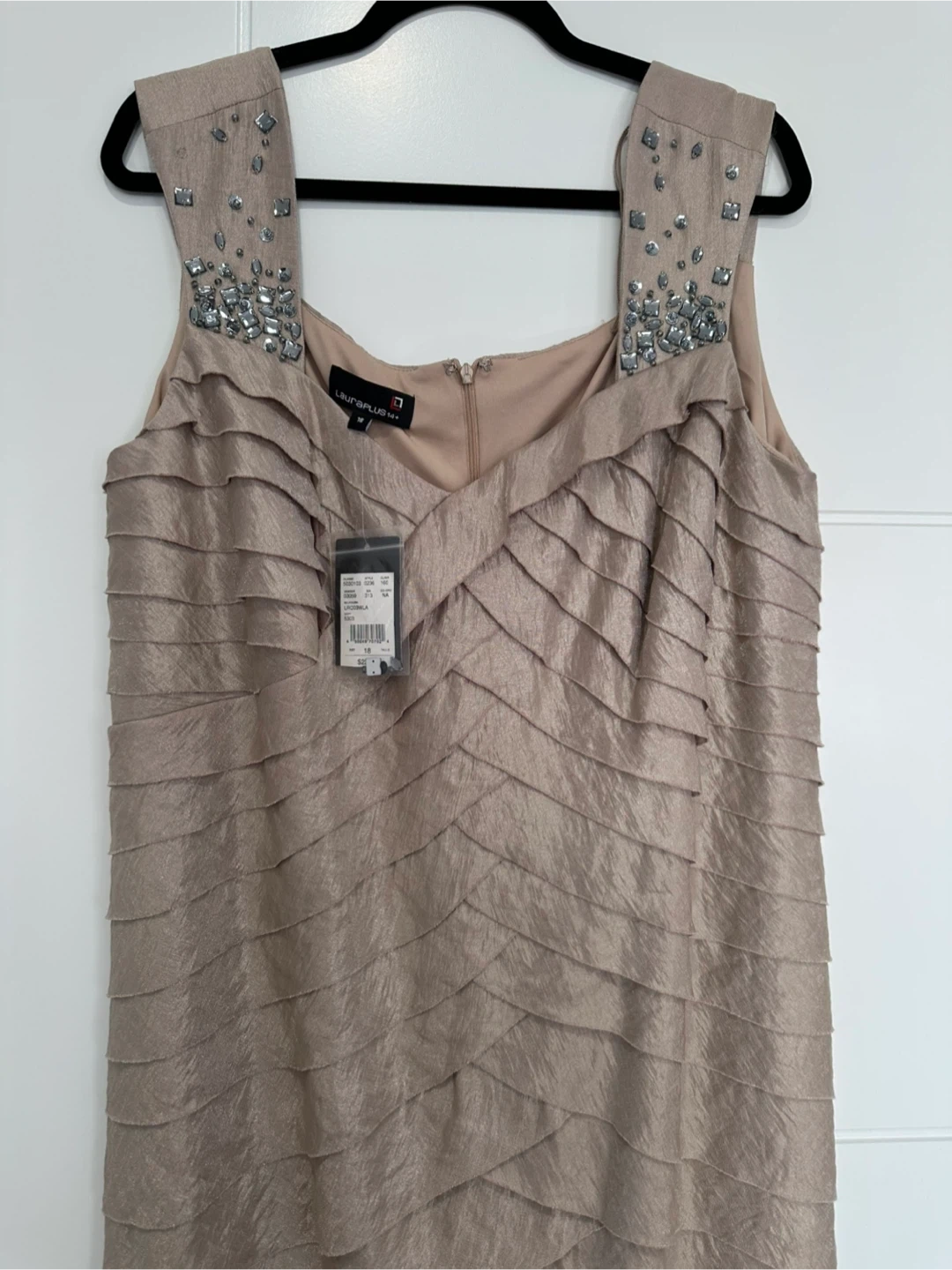 Laura Plus taupe dress with tiered detailing and embellished shoulders. Size 18. Includes original tags and extra beads.