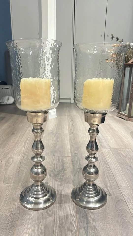 Beautiful metal candle holders with glass hurricane shades. The metal stands have a silver finish and are sturdy. Each holder has a large glass shade with a textured exterior. Includes two candle holders and two large candles.