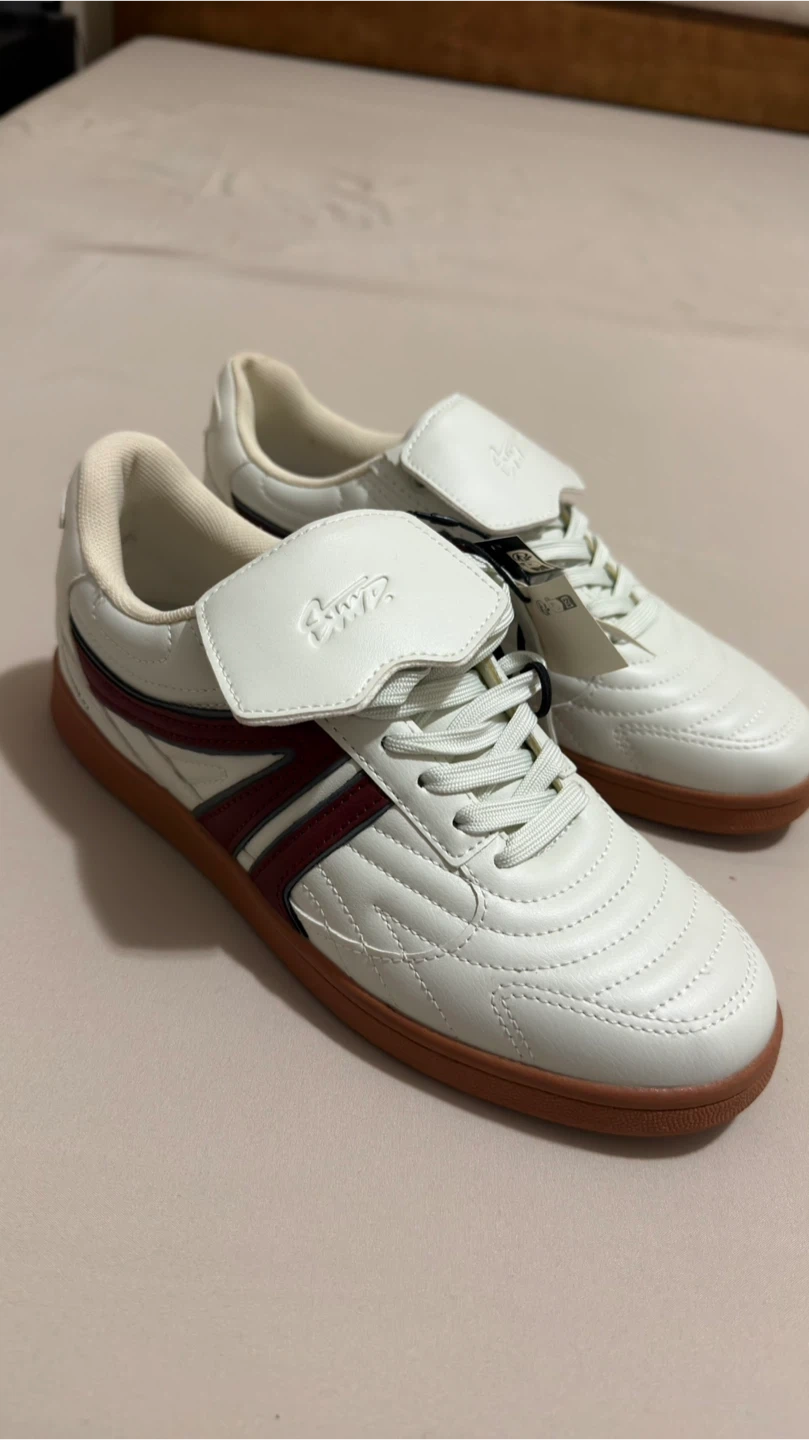 White Stylo soccer cleats with maroon stripe accents and a brown sole. Lace-up closure with an additional velcro strap for a secure fit. Perfect for indoor soccer or turf play!