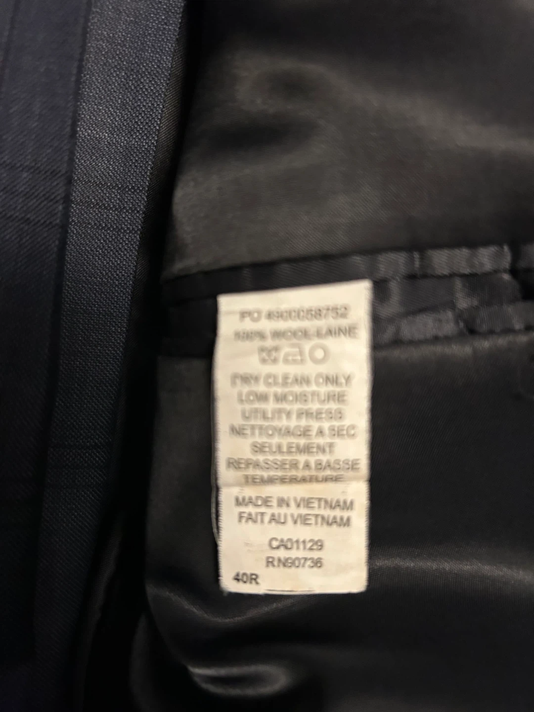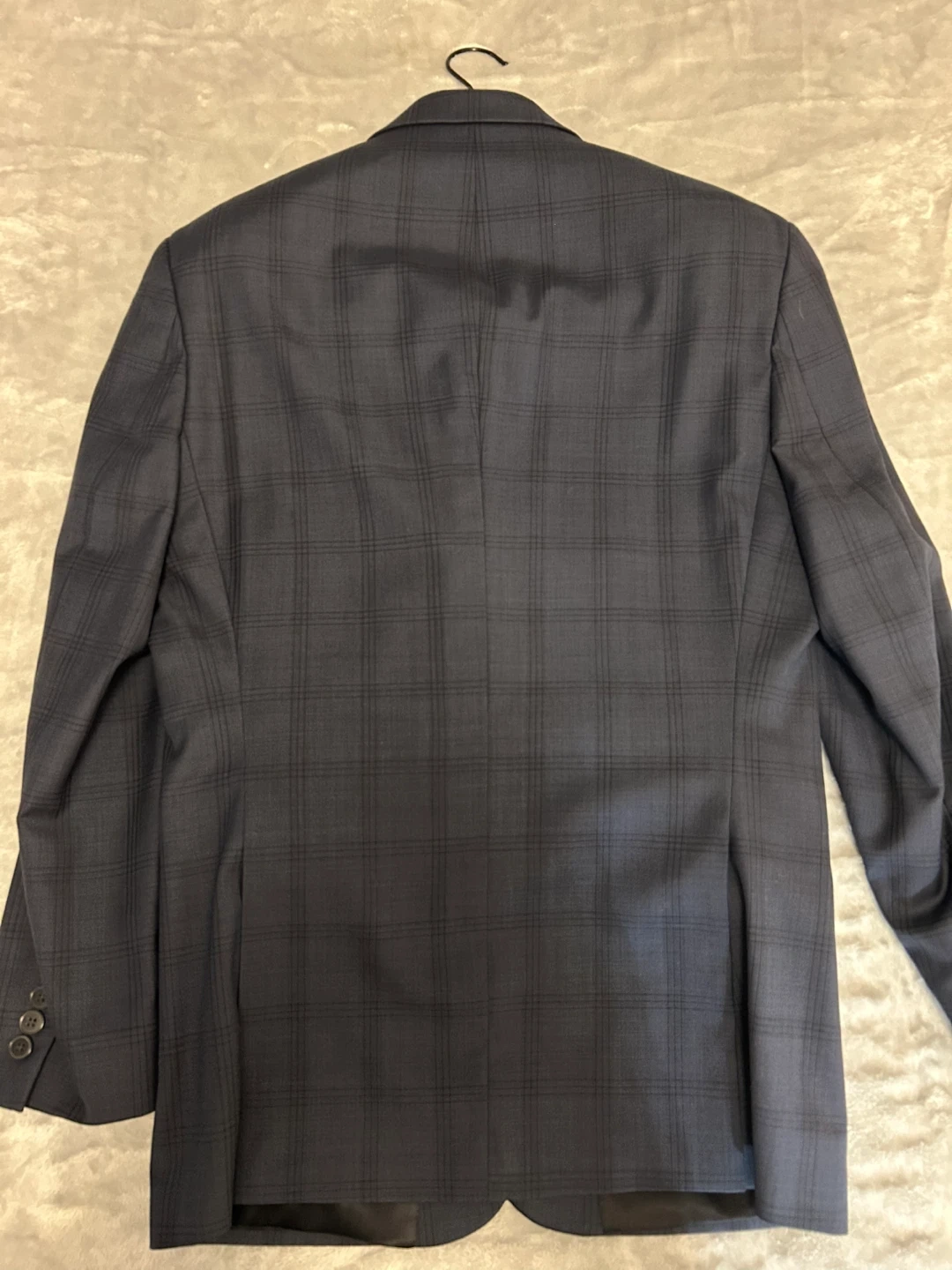 This is a Calvin Klein men's suit. It's a 40R size and features a subtle plaid pattern. The suit is made of 100% wool. It's suitable for formal occasions or professional wear. In excellent condition!