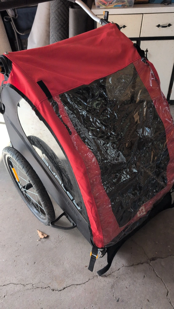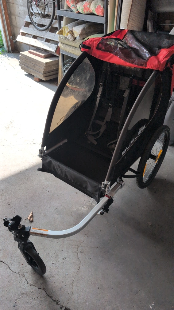 Selling a Burley child carrier bike trailer in red and black! It's in great condition - barely used and ready for some family adventures. Perfect for taking your little ones along for a bike ride or can be used as a lightweight, roomy stroller.