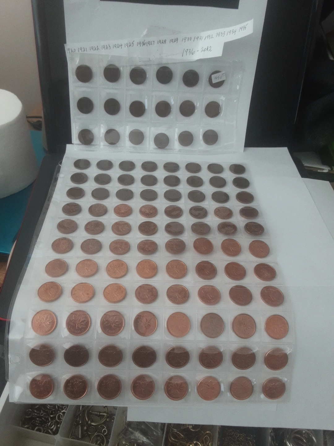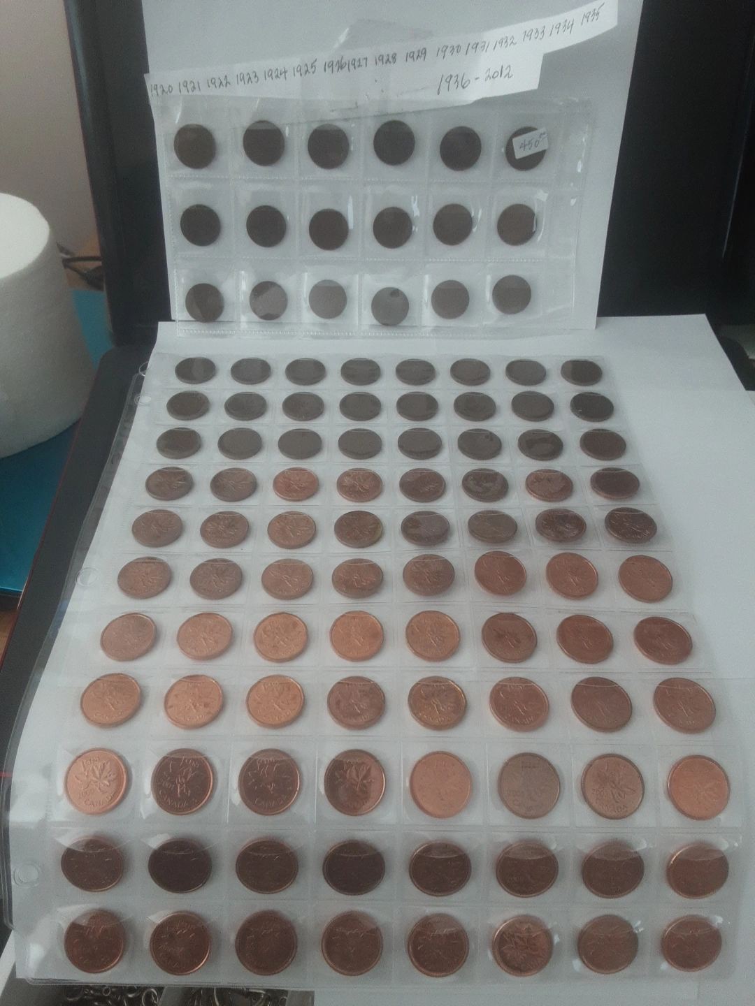 Collection of Canadian pennies in a coin album. Dates range from 1920 - 2012. 106 coins, complete set, magnetic and non magnetic. a must have for the canadian coin collector , $450.00 for viewing call 403 2411387