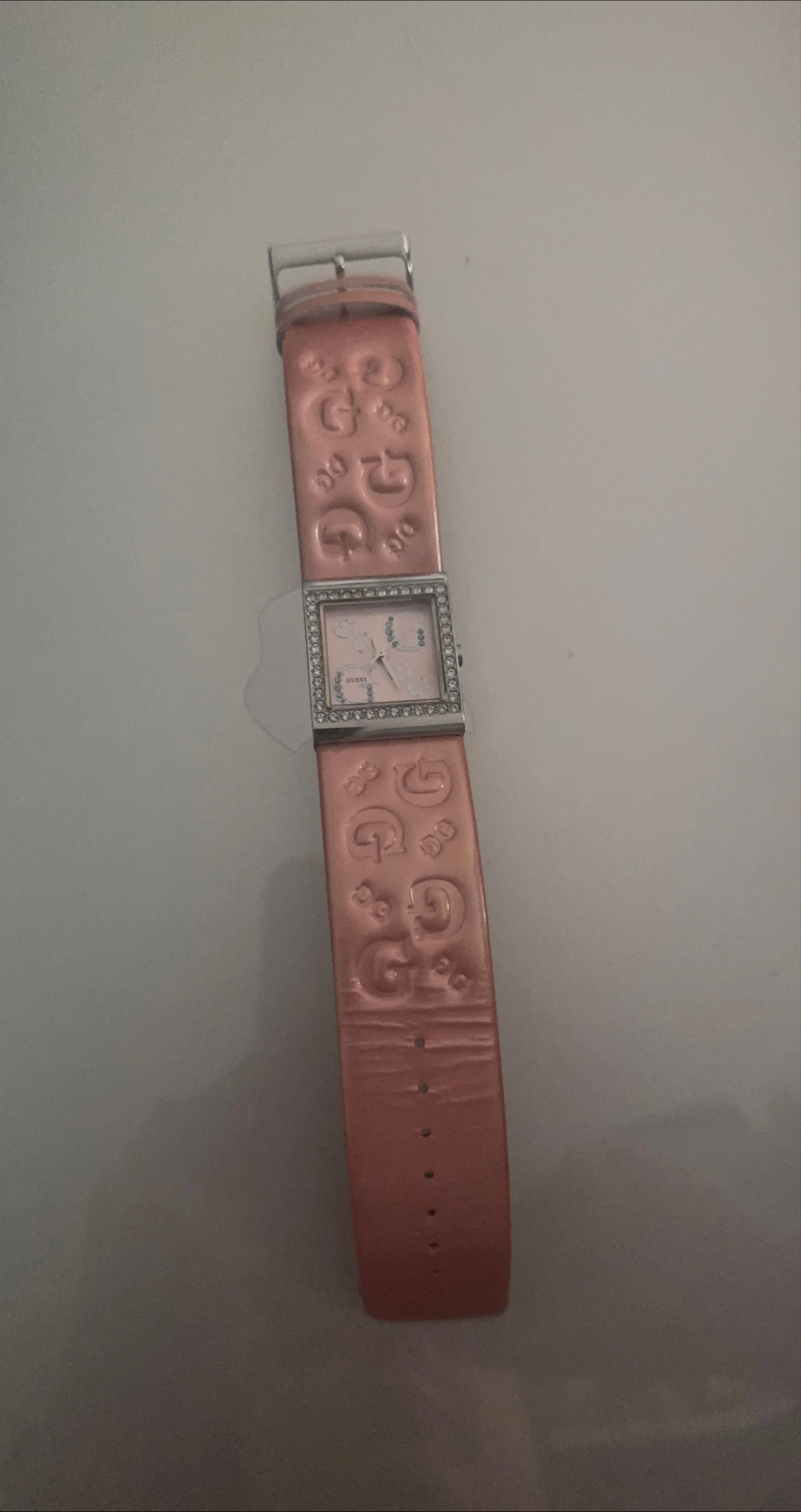 Selling a cute Guess ladies watch! It features a pink strap with the Guess logo embossed all over. The watch face is square and surrounded by rhinestones, adding a touch of sparkle. It's in good condition and ready for a new owner!