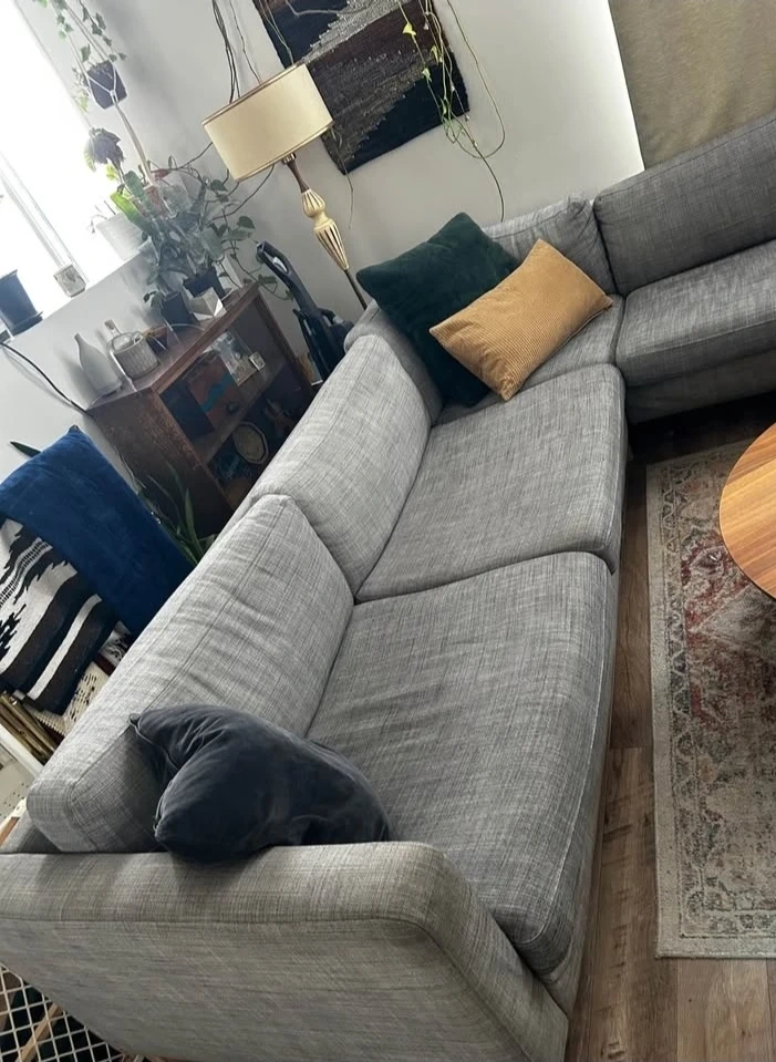 Selling a comfortable grey sectional sofa. It's in great shape and ready for a new living room! The neutral colour will match any decor