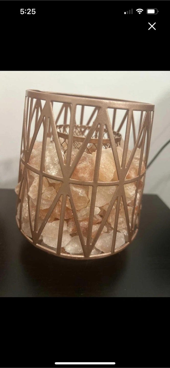 Here's a Himalayan salt lamp with a rose gold metal cage design. It's a great addition to any room for a warm and relaxing glow! Great health and wellness benefits. In perfect condition