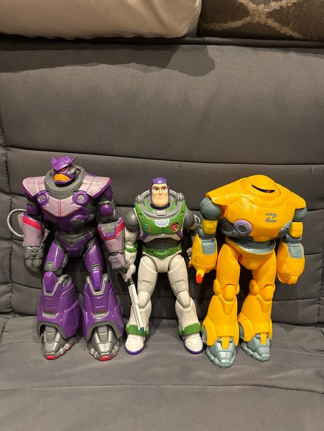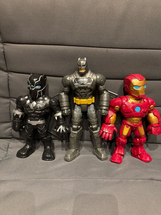 I'm selling a collection of used superhero action figures that includes popular characters such as Batman, Black Panther, Iron Man, Buzz Lightyear and Zurg from Lightyear, and a yellow robot. These figures are in good condition and are perfect for collectors or kids who love imaginative play. Although these heroes have seen some action, their superpowers are still fully charged, ready for their next adventure in a new home! Grab them before they fly off to another galaxy! All for $5 !