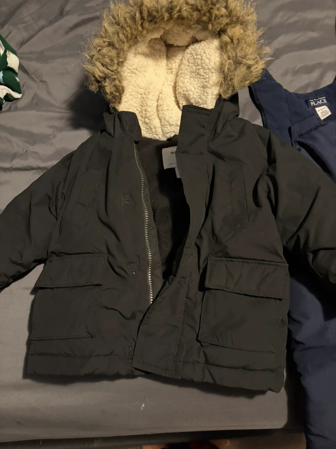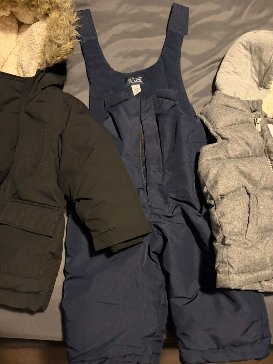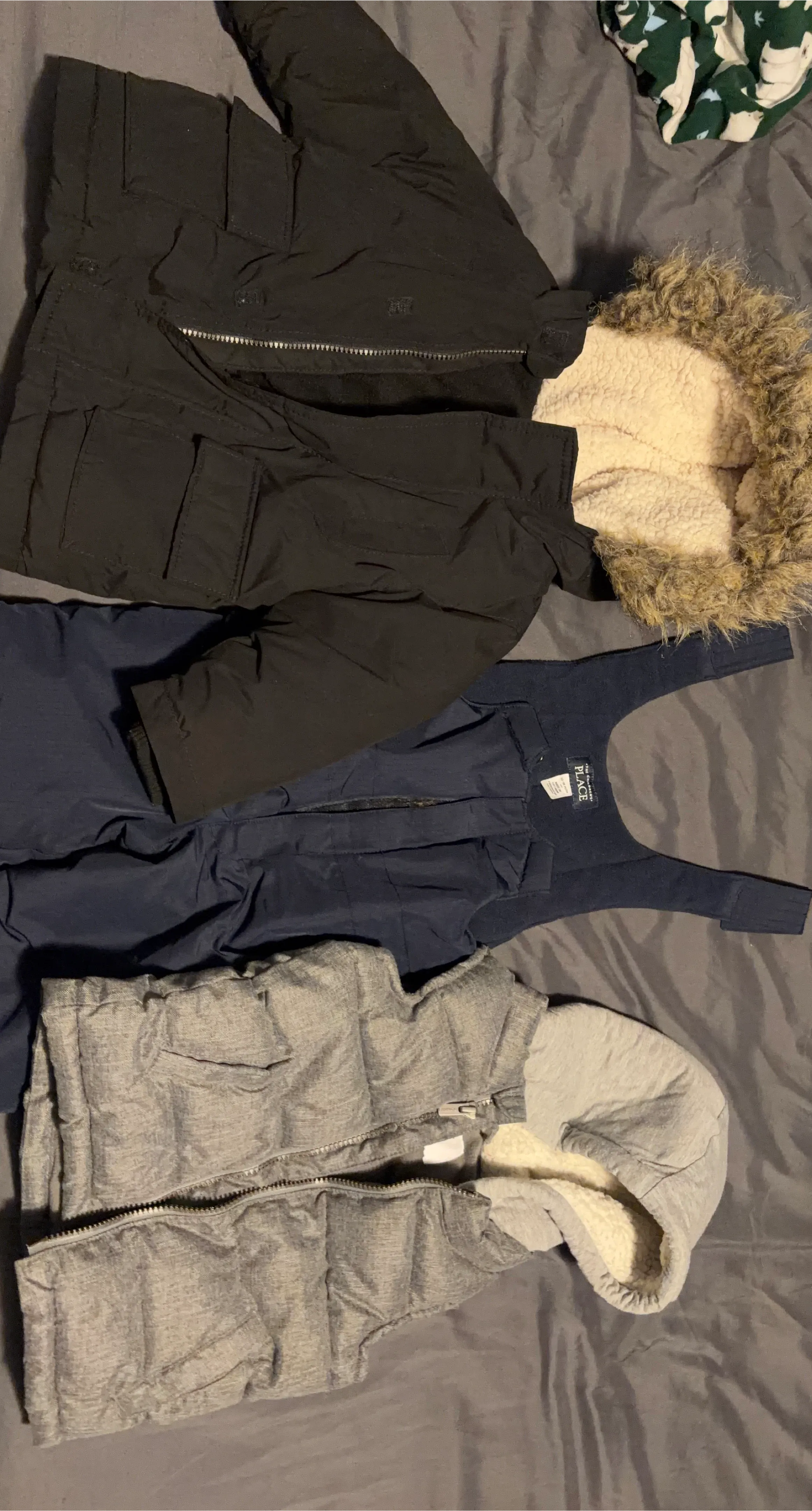Soft grey puffer vest with a warm sherpa-lined hood. 18-24 months. It's perfect for layering on cooler days. black jacket size 2T. snowpants 12-18M.