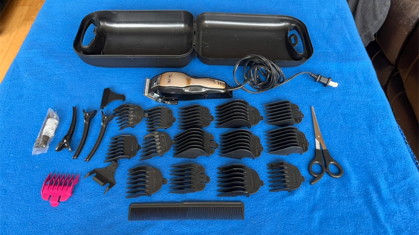 WAHL corded hair clipper set. It comes with multiple attachment combs, scissors, a comb, and a storage case. This kit is suitable for home haircuts and touch-ups.