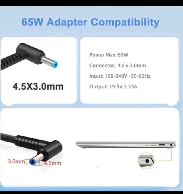This is a 65W AC charger compatible with HP Elitebook laptops, models 830 G5, 840 G3, G4, G5, 850 G3, G4, and G5, as well as ProBook models 450 G3, G5, G6, G8, and ProBook 446. The HP model number is 13252, TPN-LA16, and PPP009A. It features a 4.5 * 3.0mm blue tip power supply adapter cord.