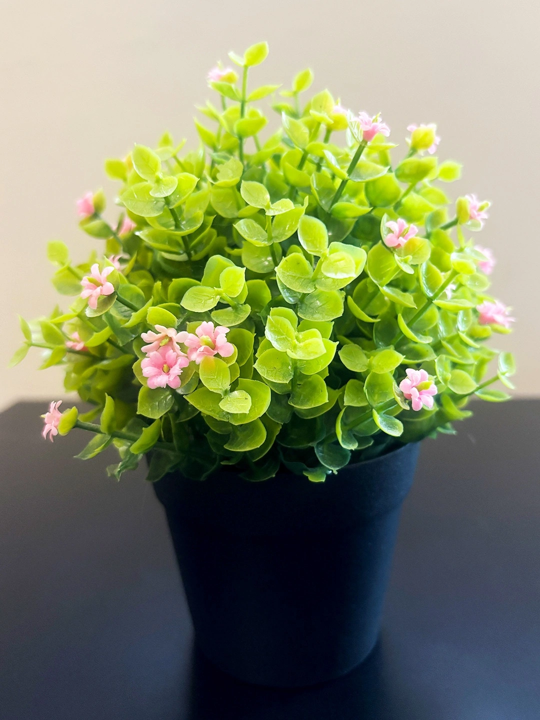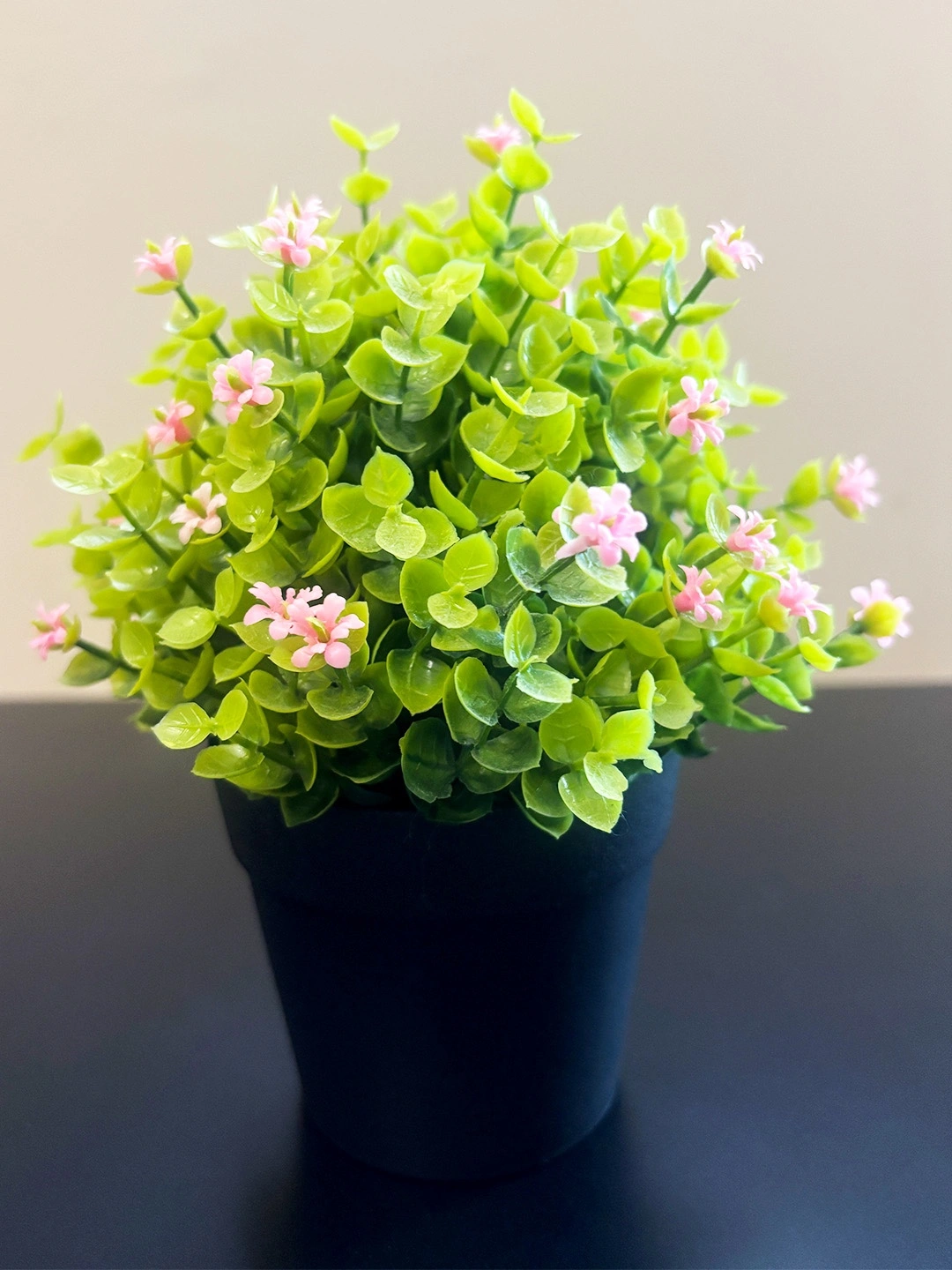 This soft and sweet artificial plant adds charm to any room with its tiny pink flowers and lush green leaves. No watering needed — just instant calm and color wherever you place it!