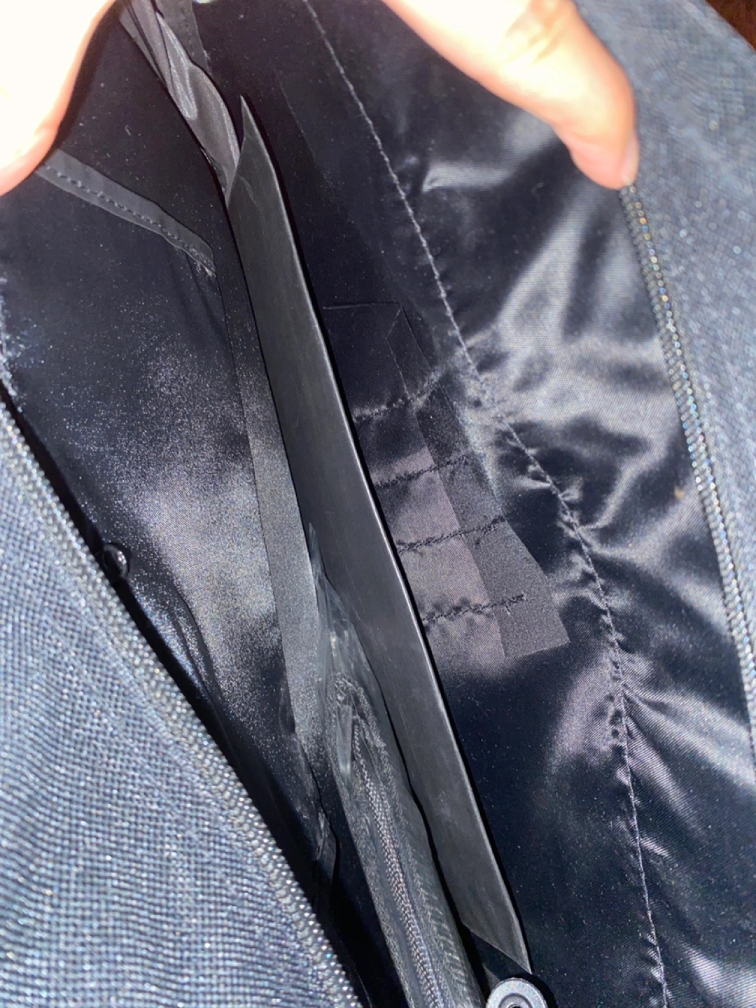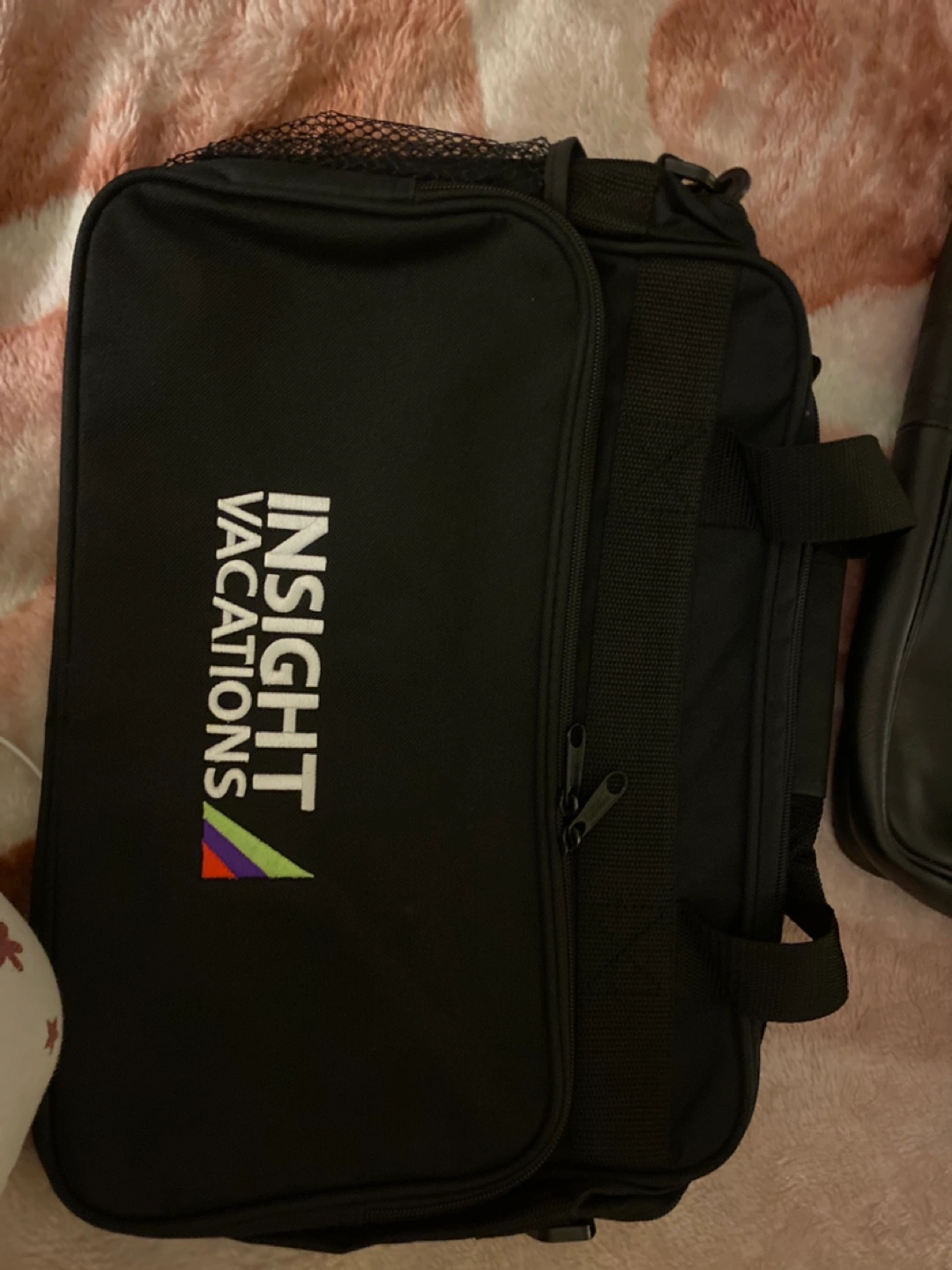 Black travel bag. Features a zipper closure, top carry handle, and interior pockets. Great for short trips or carrying personal items.