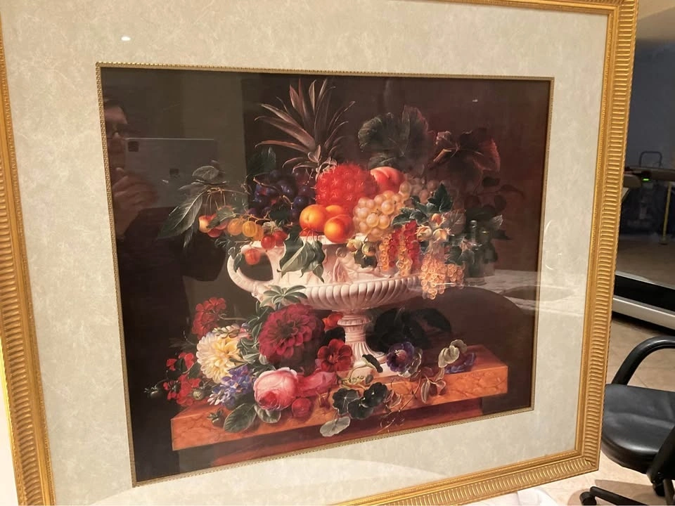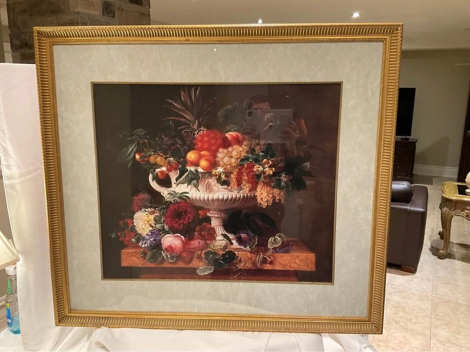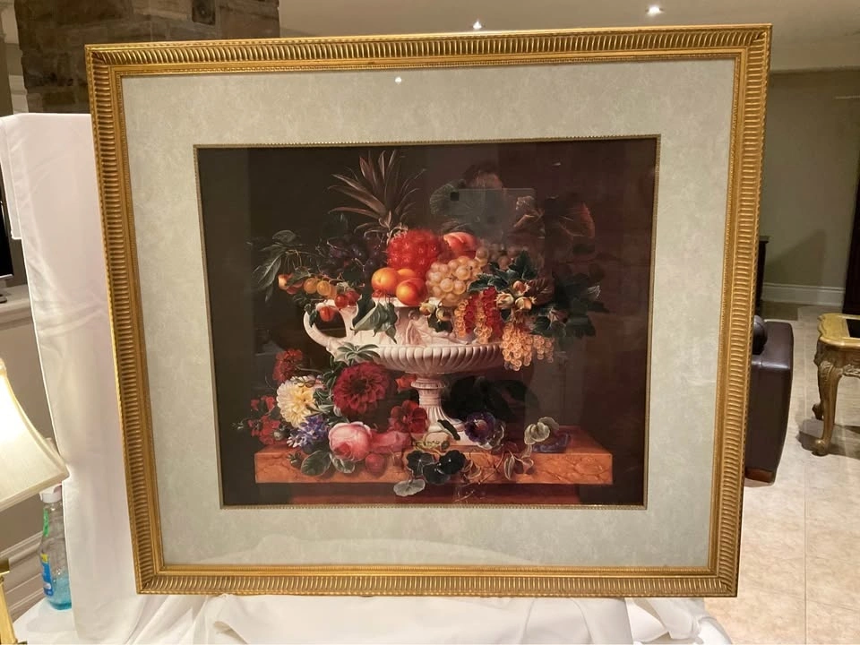 Stunning print of fruits in a bowl in an ornate frame. Large print, 37" x 32 1/2". Vibrant floral colors. Excellent condition and beautifully framed. #355/2000PN. Cash Only - Richmond Hill Bathurst and King.