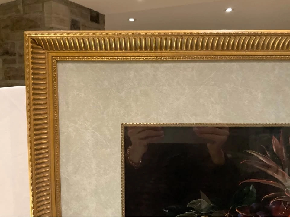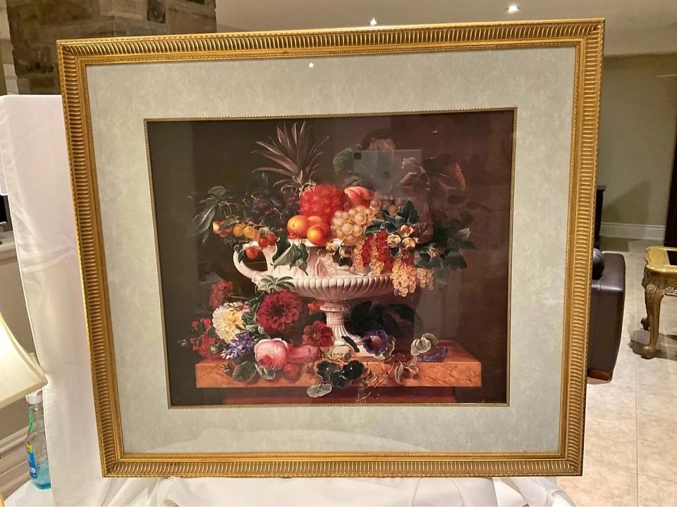 Stunning print of fruits in a bowl in an ornate frame. Large print, 37" x 32 1/2". Vibrant floral colors. Excellent condition and beautifully framed. #355/2000PN. Cash Only - Richmond Hill Bathurst and King.