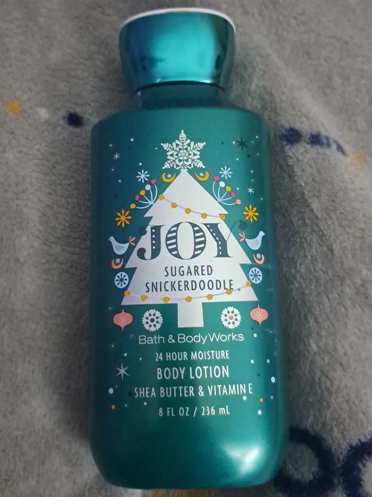 Selling a bottle of Bath & Body Works Sugared Snickerdoodle body lotion. It provides 24-hour moisture and contains shea butter and vitamin E. The bottle contains 8 fl oz / 236 ml