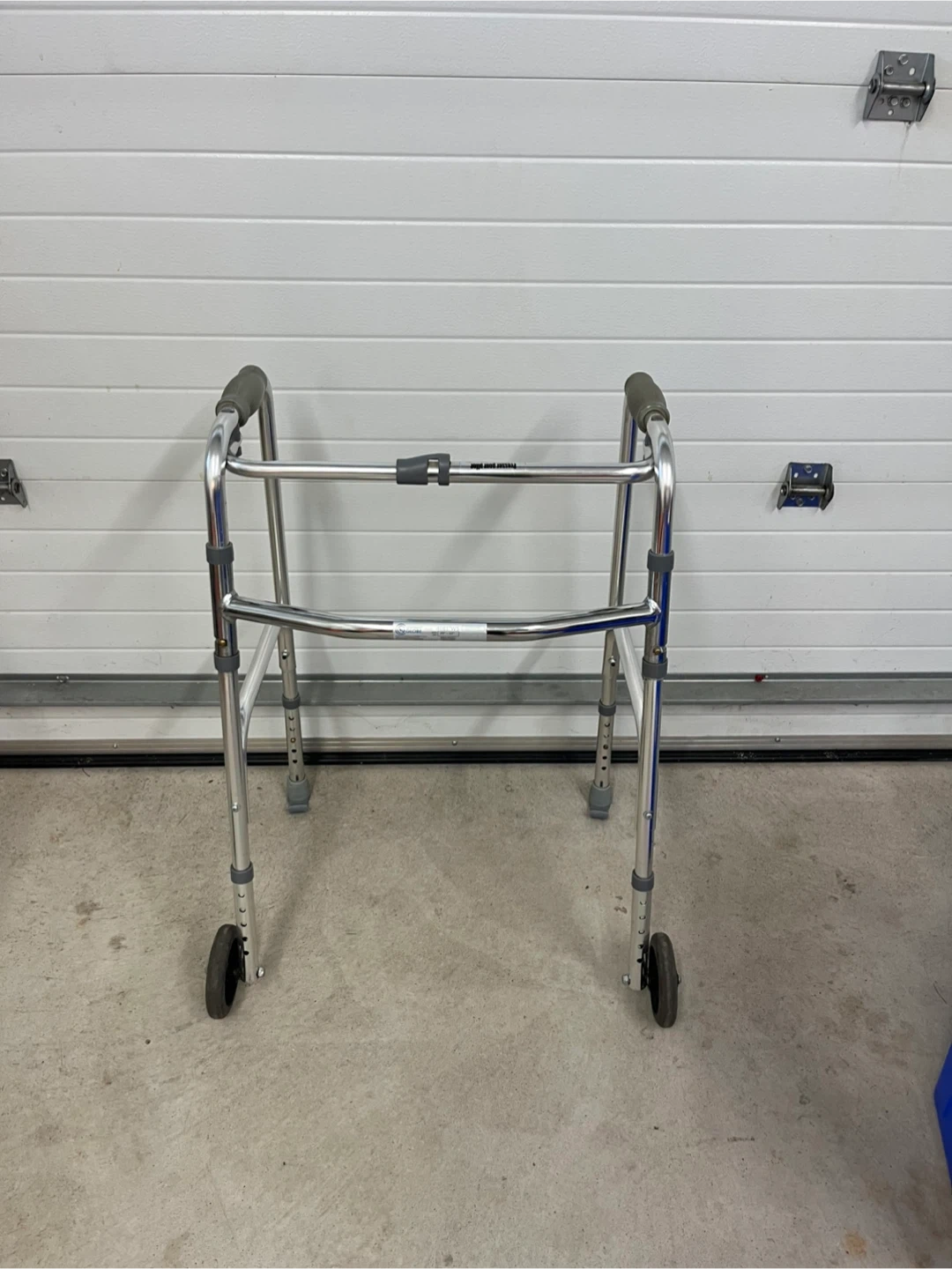 Selling a rolling walker. It's in good condition and ready to help someone get around! It has wheels on the front for easy movement and adjustable legs for a comfortable height