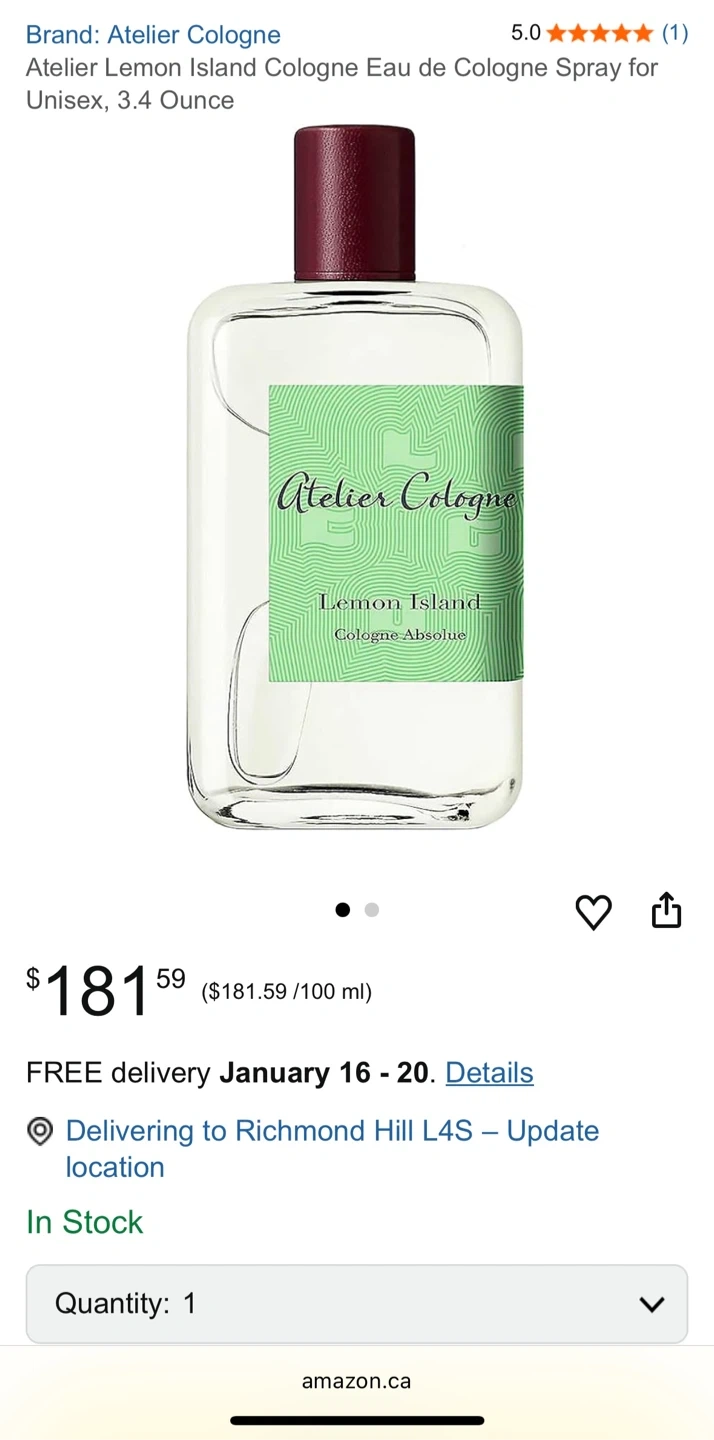 Selling a bottle of Atelier Cologne Lemon Island Eau de Cologne. It's a unisex fragrance, 3.4 ounce size. Retail price $181.59. Perfect for anyone who loves a fresh, citrusy scent