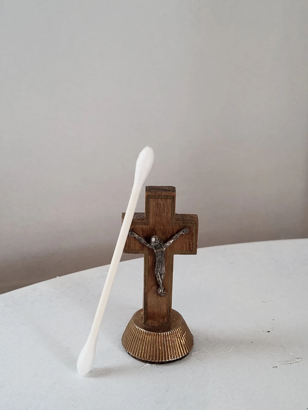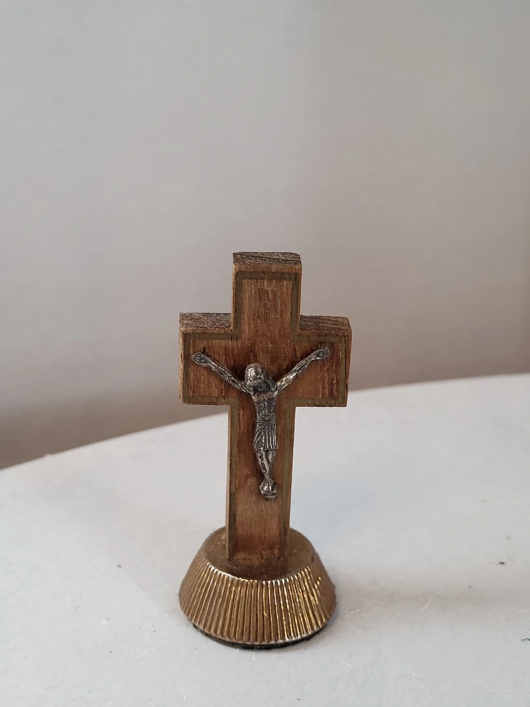 Selling a vintage crucifix. It's a small wooden cross with a metal figure on it, mounted on a decorative gold-coloured base. A nice piece for display