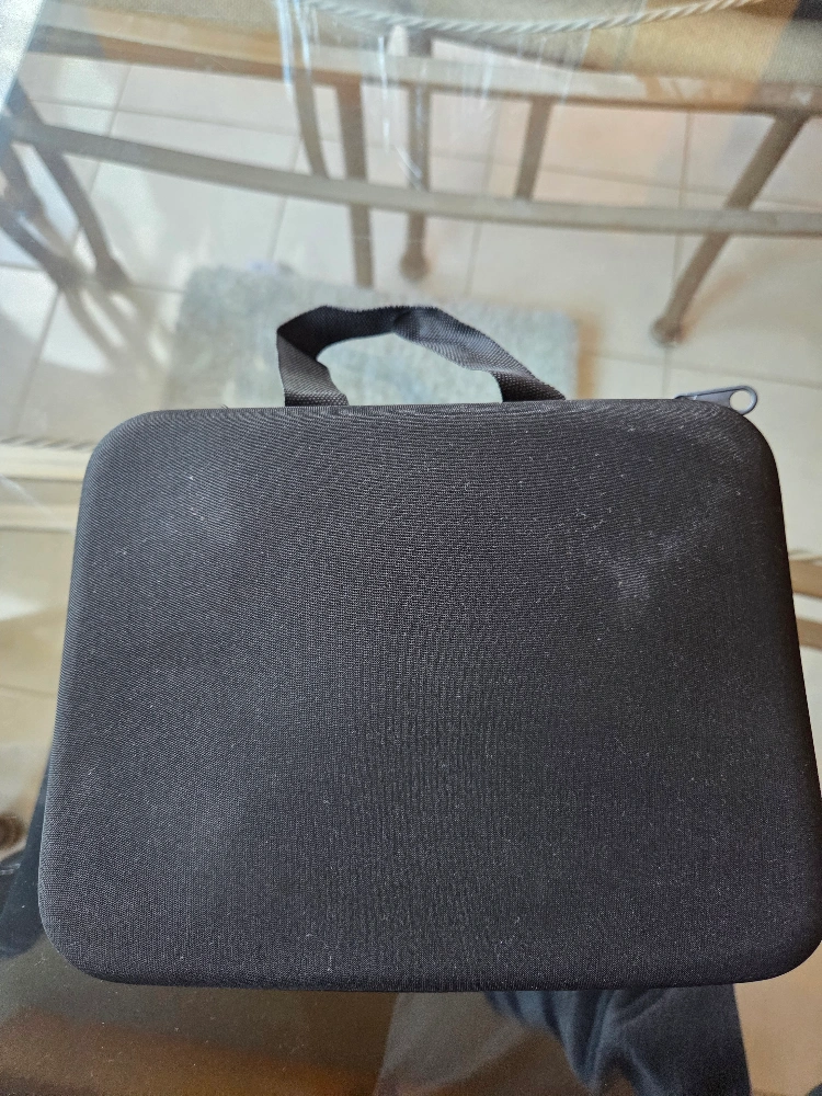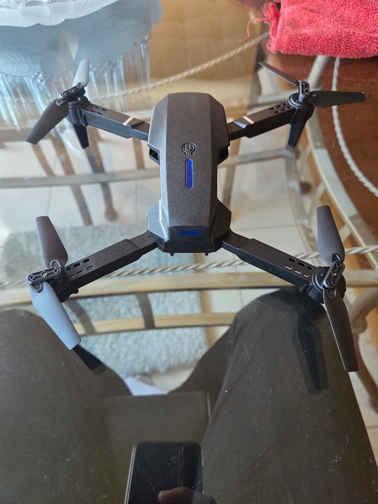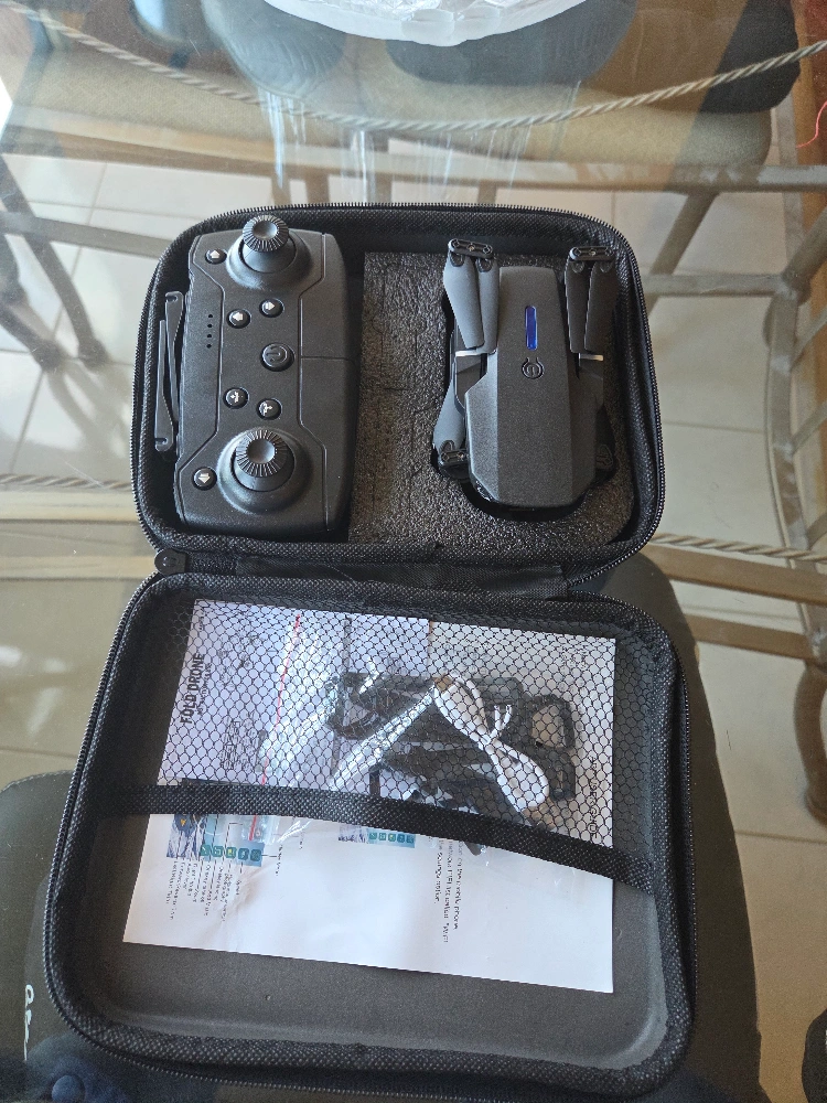 Selling a foldable black drone that's in great shape! It comes with a carrying case, remote controller, extra propellers, and what appears to be some instructions. Perfect for some outdoor fun!