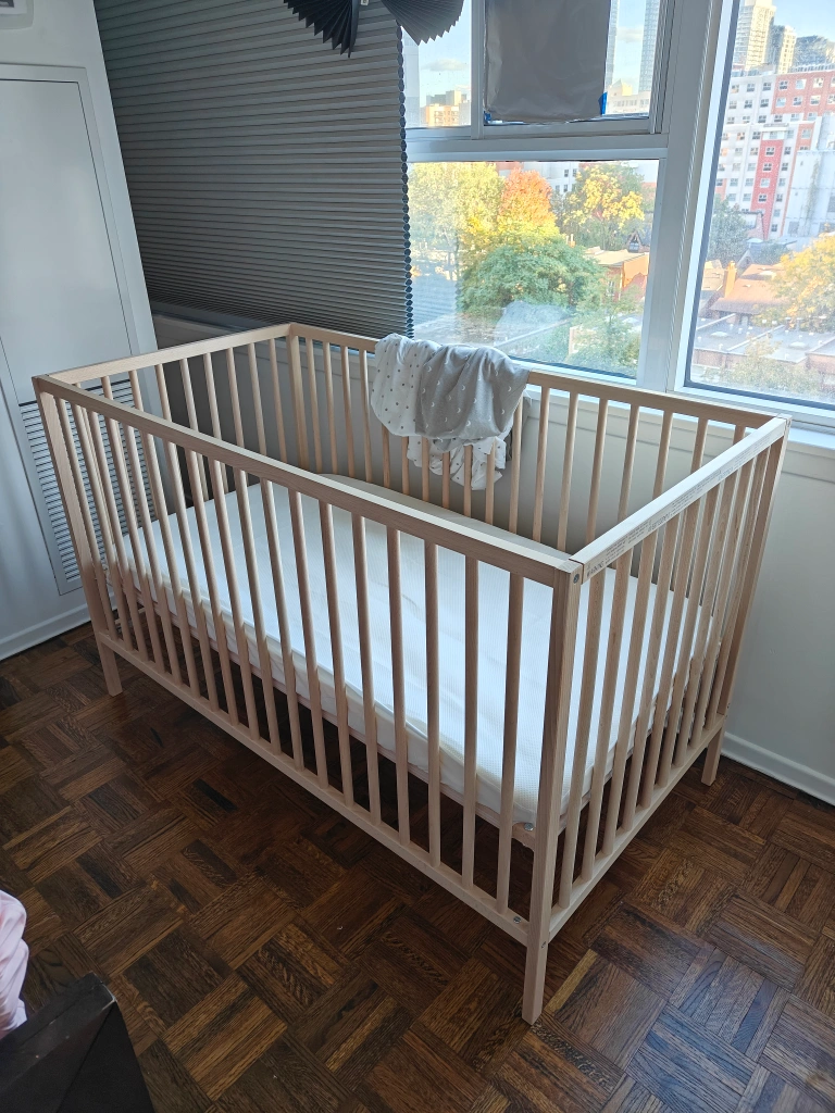Brand new IKEA SNIGLAR crib made of beech. It's sized at 70x132 cm (27 1/2x52 "). I also have a PELLEPLUTT foam mattress for the crib, LENAST mattress protector, and two LENAST crib fitted sheets.