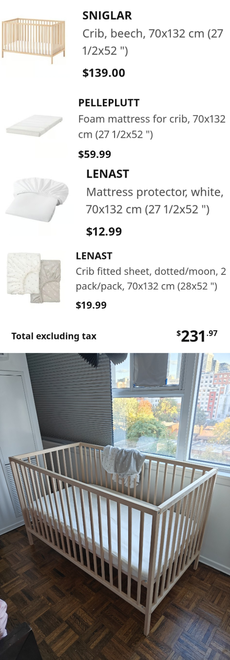 Brand new IKEA SNIGLAR crib made of beech. It's sized at 70x132 cm (27 1/2x52 "). I also have a PELLEPLUTT foam mattress for the crib, LENAST mattress protector, and two LENAST crib fitted sheets.