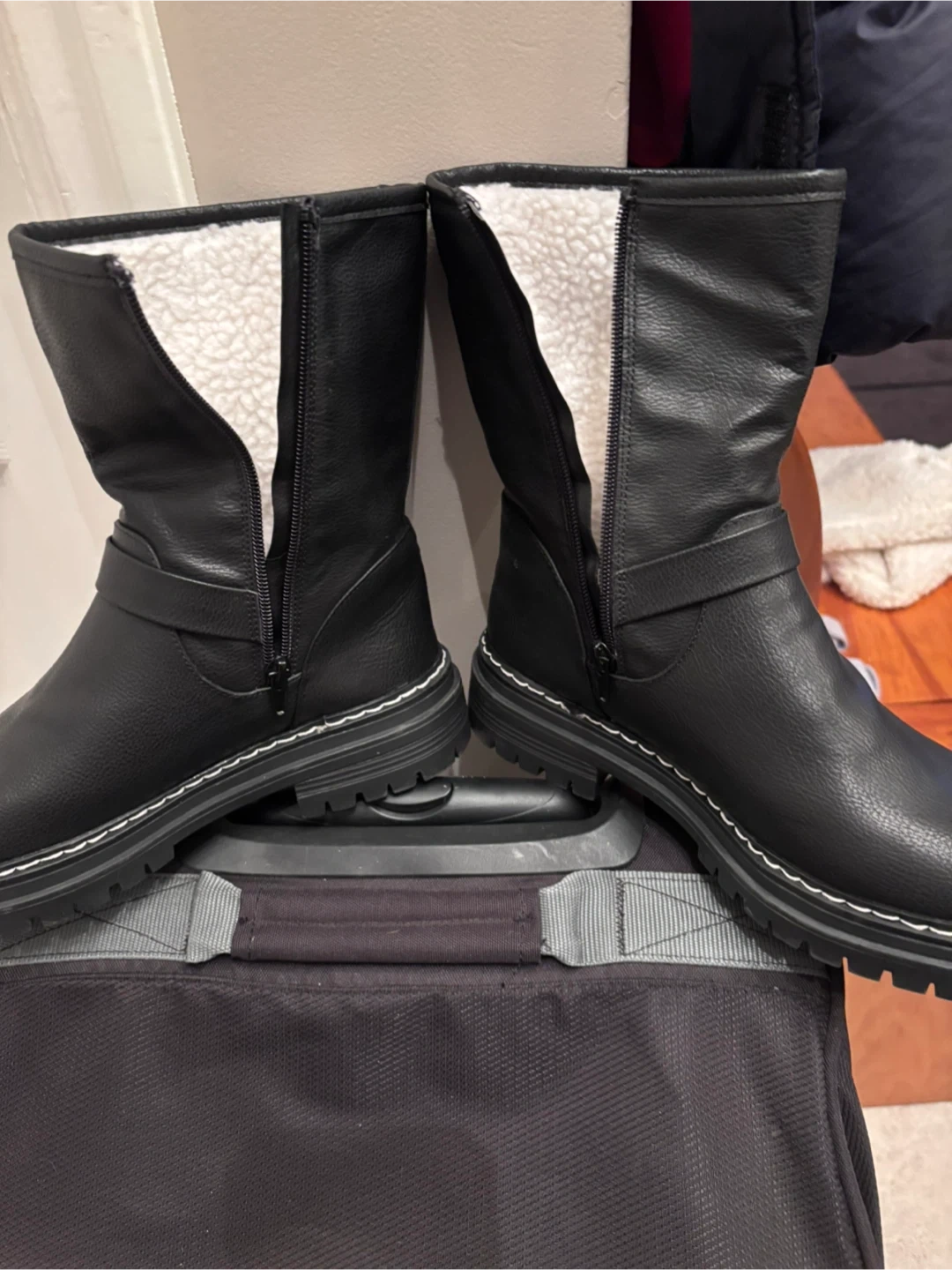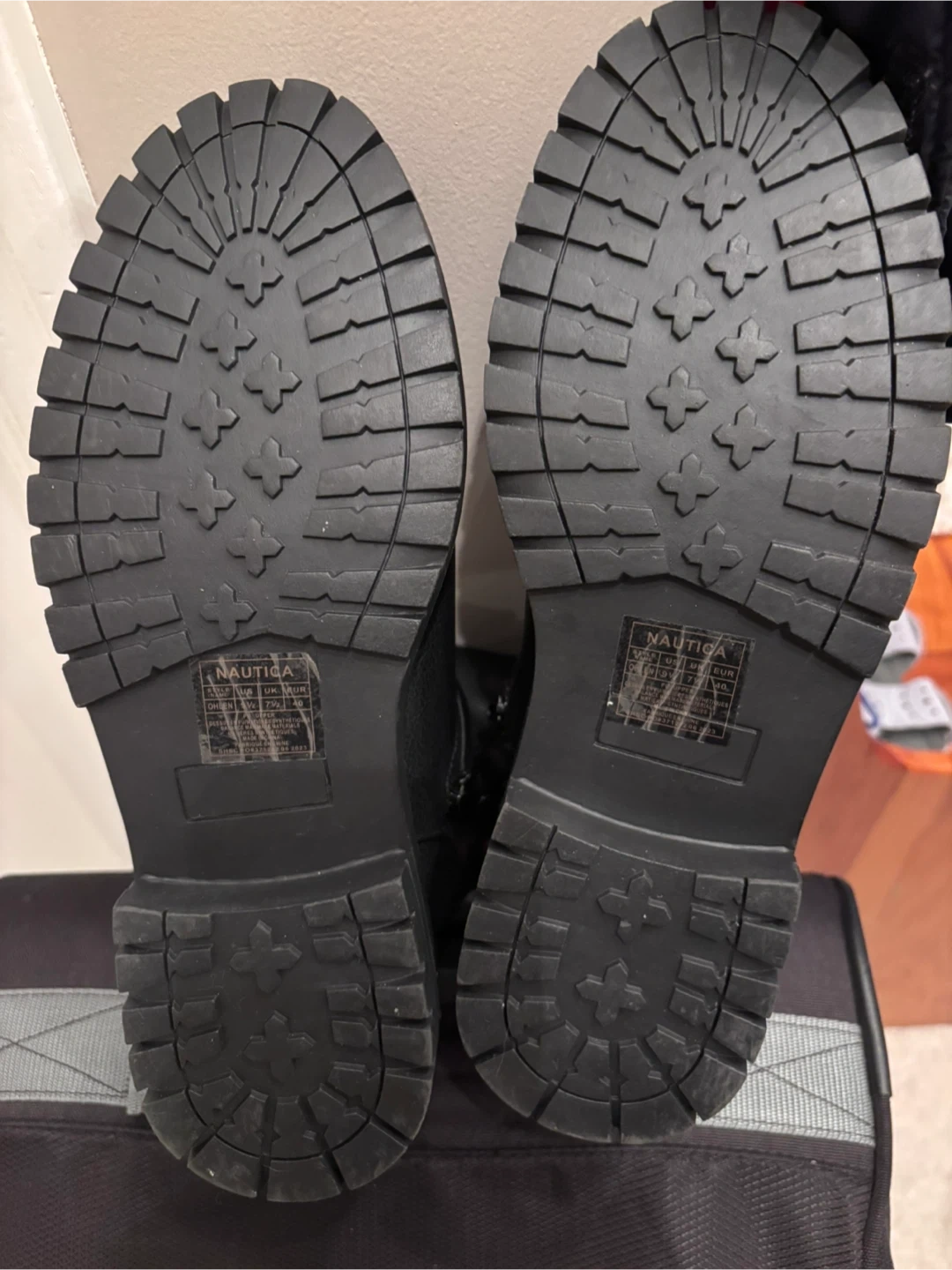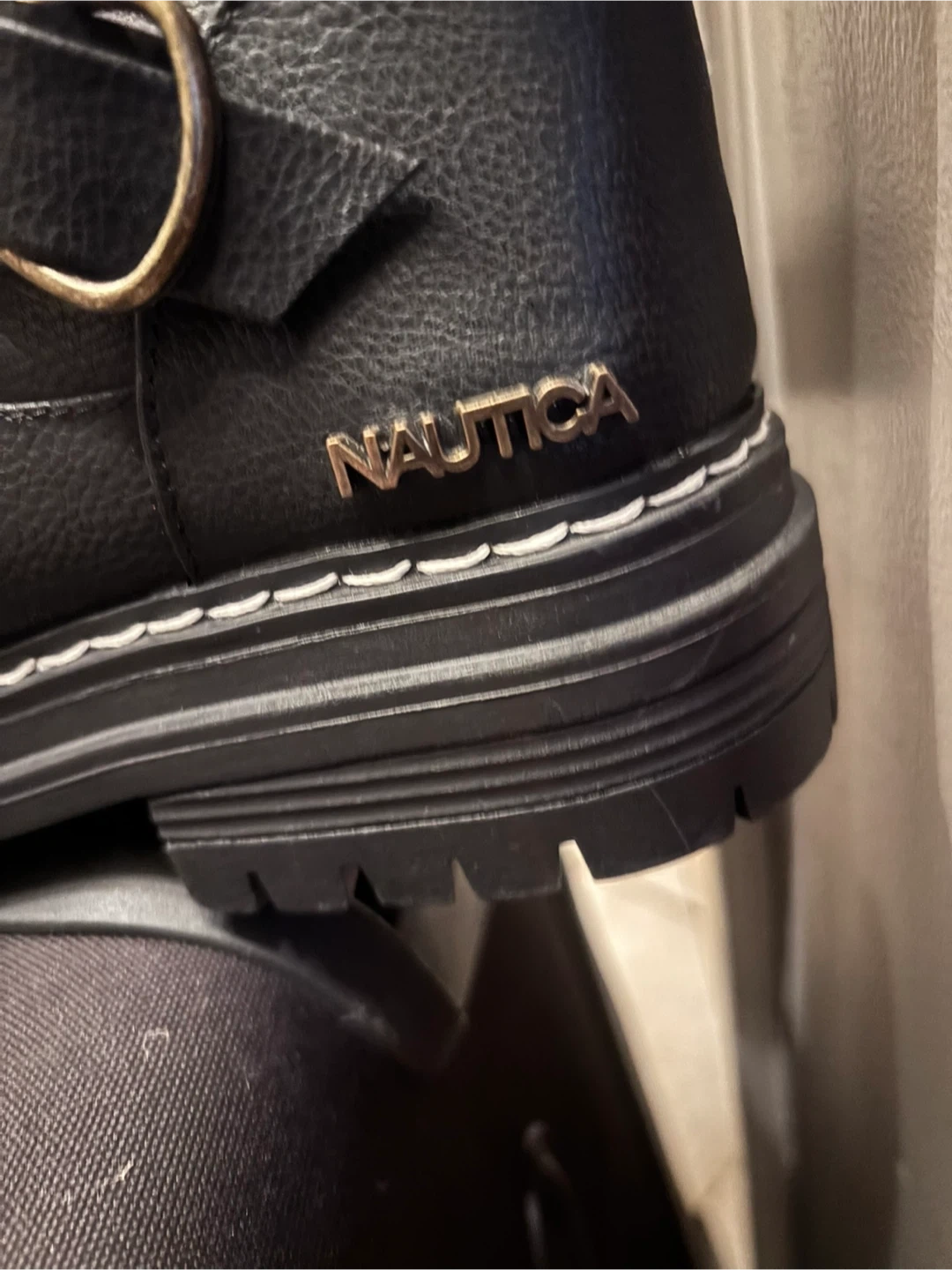 Nautica black winter boots with cozy sherpa lining. They feature a side zipper and buckle detail. Durable lug sole.