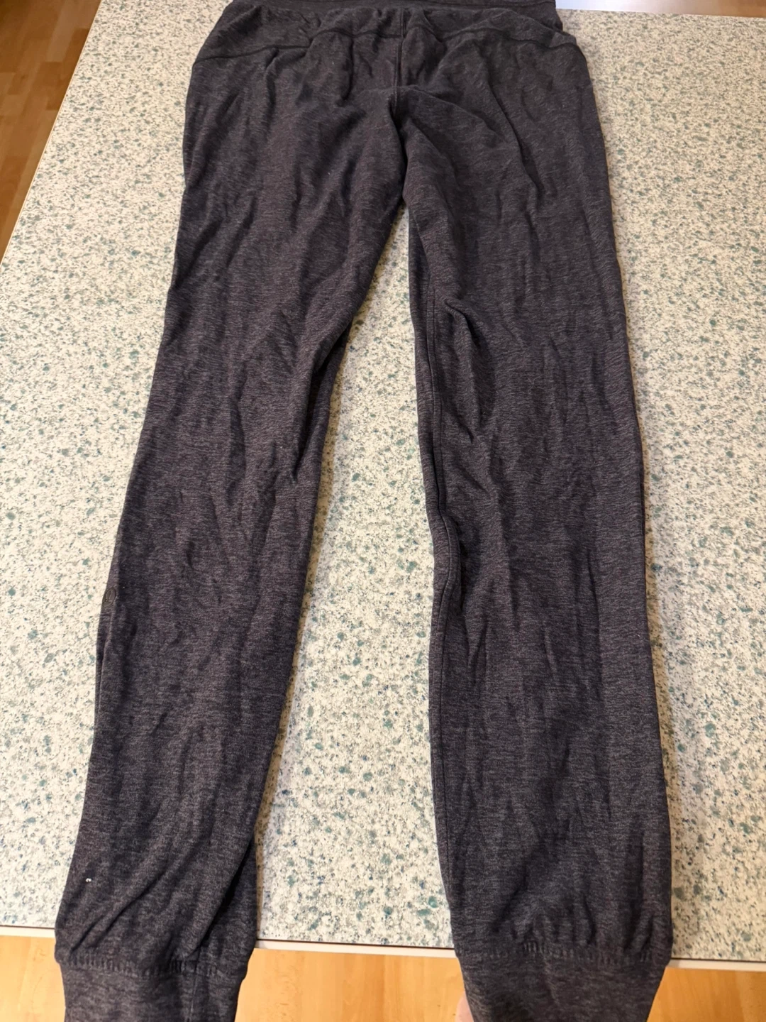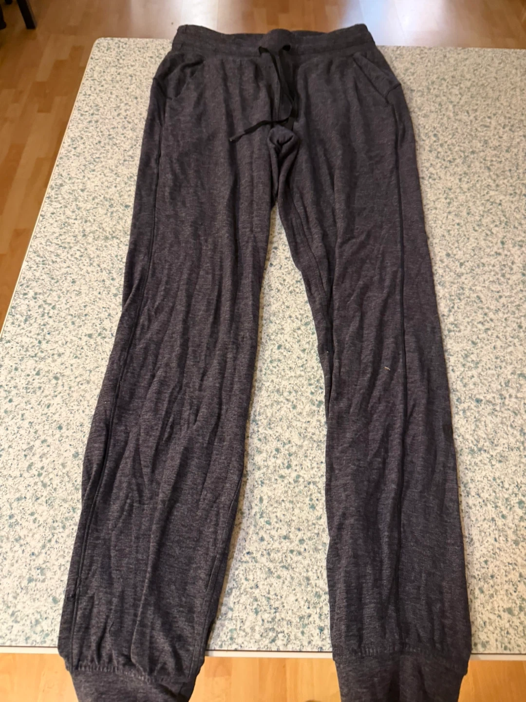 These Lululemon jogger pants are a comfy dark grey colour. They're made from a soft, heathered fabric with a drawstring waist. Perfect for lounging or light workouts!