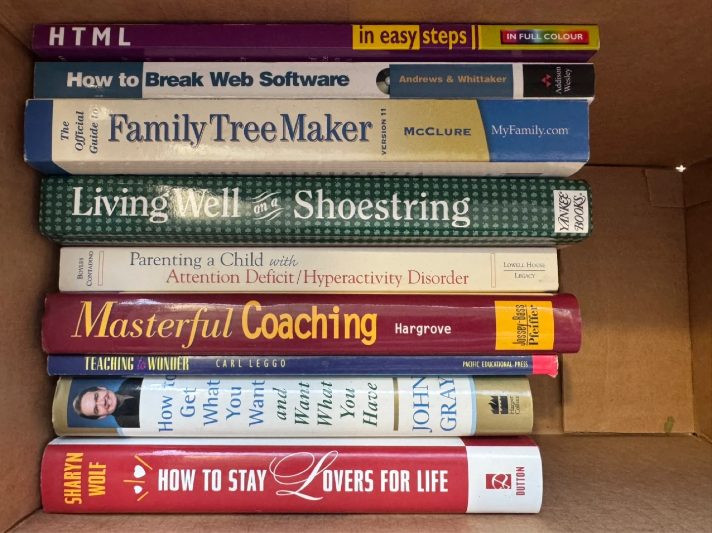 A collection of books including 'HTML in Easy Steps', 'How to Break Web Software', 'Family Tree Maker', 'Living Well on a Shoestring', 'Parenting a Child with Attention Deficit/Hyperactivity Disorder', 'Masterful Coaching', 'Teaching is Wonder', 'How to Get What You Want and Want What You Have', 'How to Stay Lovers for Life', 'Love Smart', 'Self Matters', 'The Life Strategies', 'The Year-Round Gas Barbecue Cookbook', 'Leonardo Da Vinci', and 'The New York Times Crosswords to Exercise Your Brain'. $60 for the lot of 17 books. Located in Oliver
