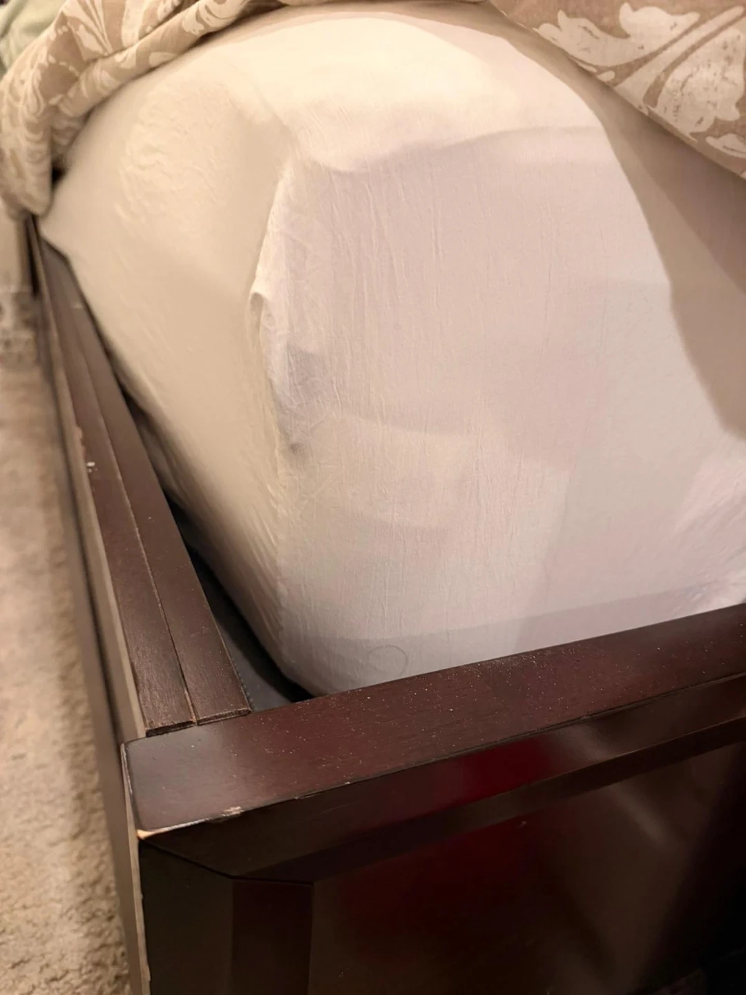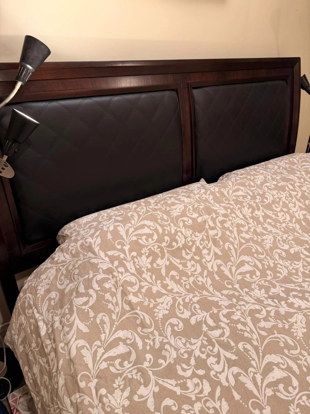 This dark wood king size bed frame features upholstered diamond-stitched panels in a deep brown colour. It's a solid piece that would complement many bedroom styles. The headboard is solid wood as is the bed frame. With box spring only.. Mattress not included