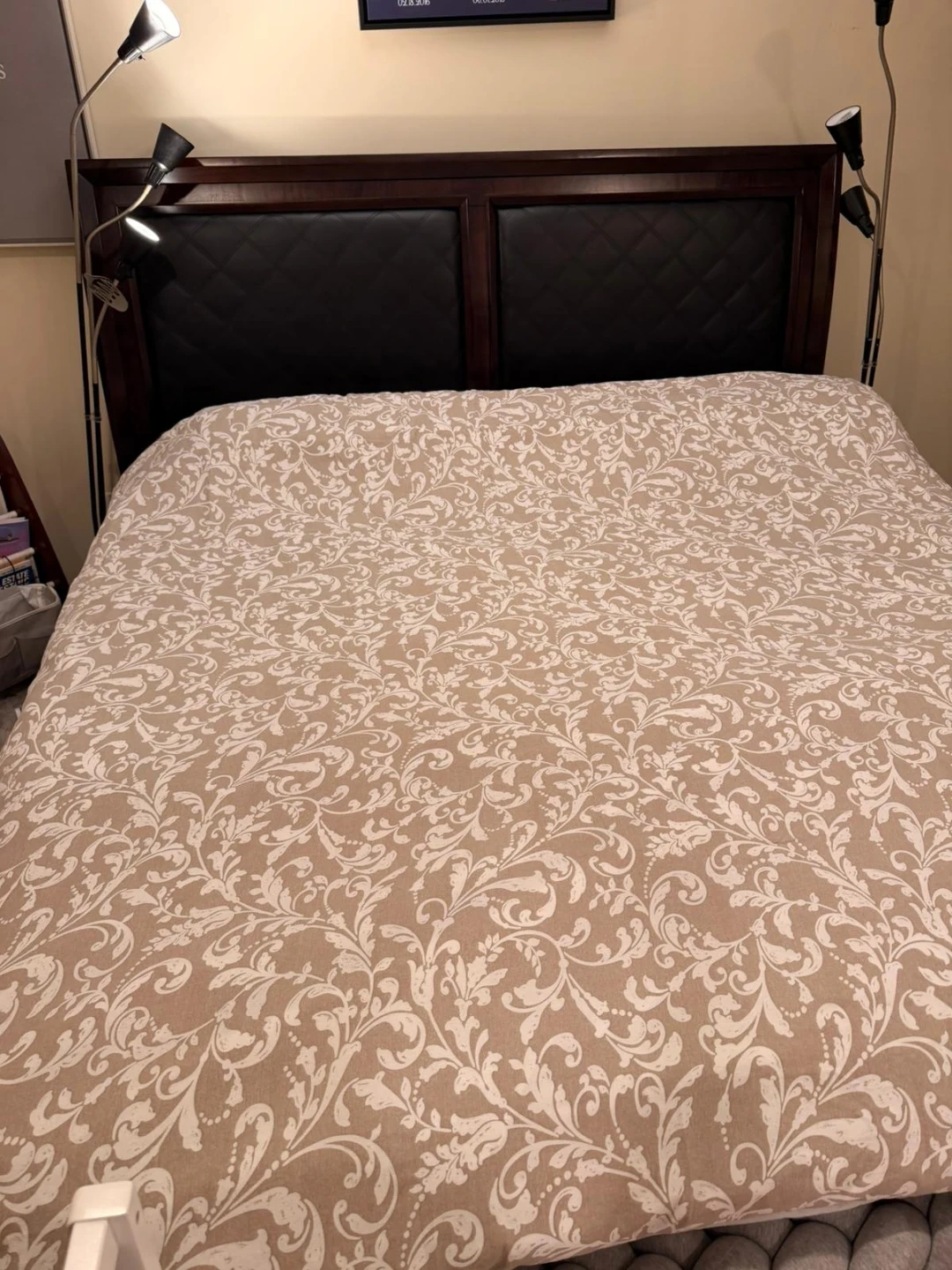 This dark wood king size bed frame features upholstered diamond-stitched panels in a deep brown colour. It's a solid piece that would complement many bedroom styles. The headboard is solid wood as is the bed frame. With box spring only.. Mattress not included